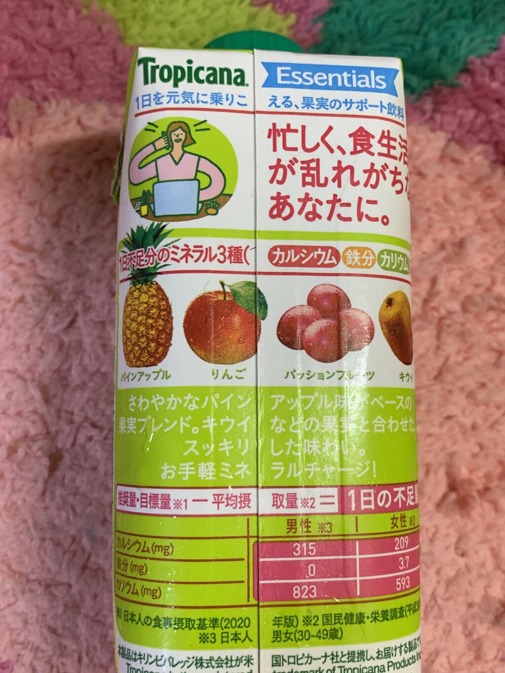 不足しがちなカルシウムや鉄分、カリウムを補ってくれるドリンクです😊 味はとってもフルーティ! パッケージに描かれたパインはもちろん、 りんごやパッションフルーツ、キウイなども入っているみたい🍎🥝 味はパイン強め酸味があってスッキリ系! 思ったより味は濃かったかな〜😀🍍