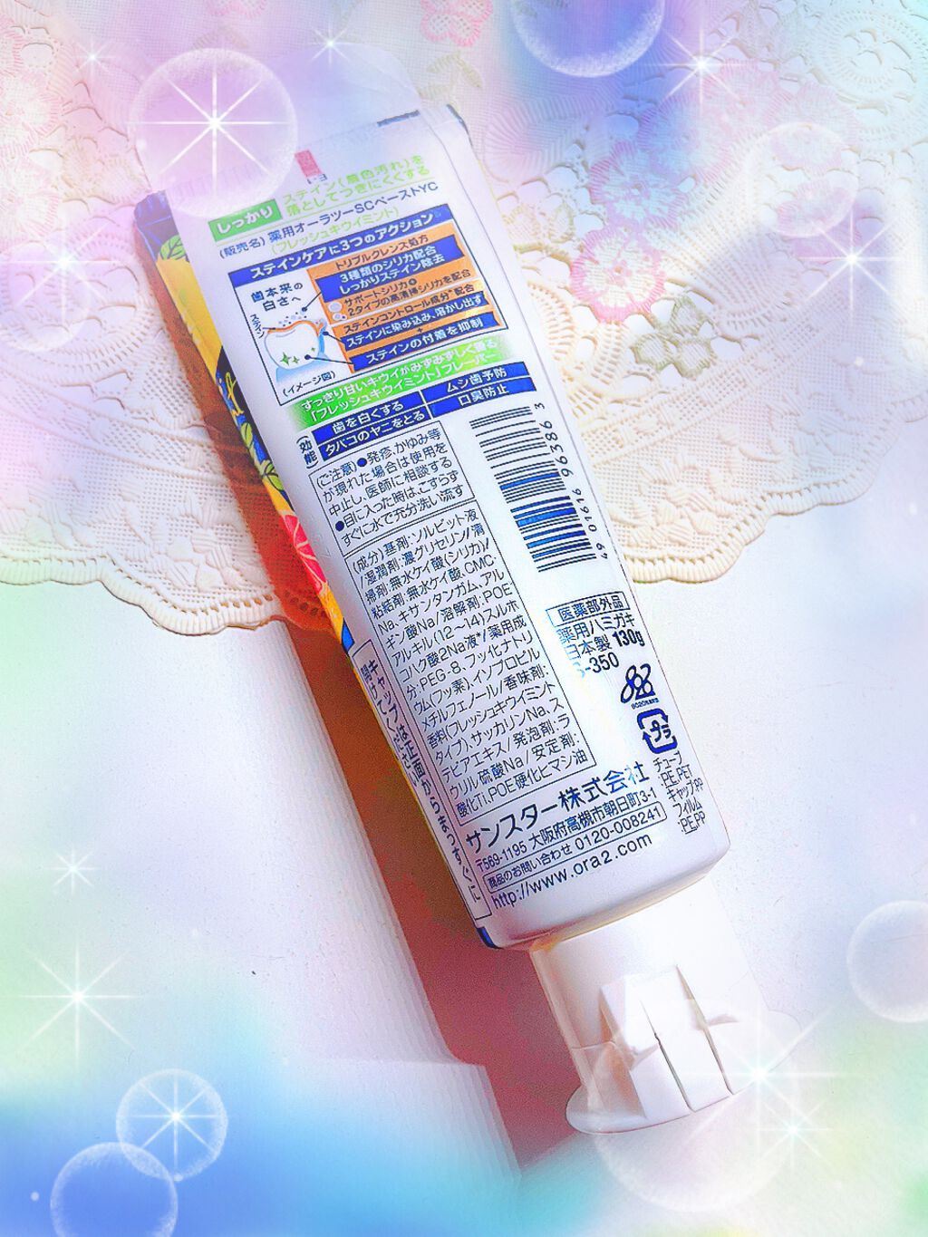 - 【医薬部外品】 ①ステインコントロール成分*1がステインに染み込んで、浮かしだします。 ②3種類のシリカ*2で歯のステインを落とします。 ③ステインコントロール成分がステインをつきにくくすることで、歯本来の白さを取り戻し、キレイな歯を保ちます。 *1 POEアルキル(12-14)スルホコハク酸2Na液(溶解剤) *2 無水ケイ酸(清掃剤)