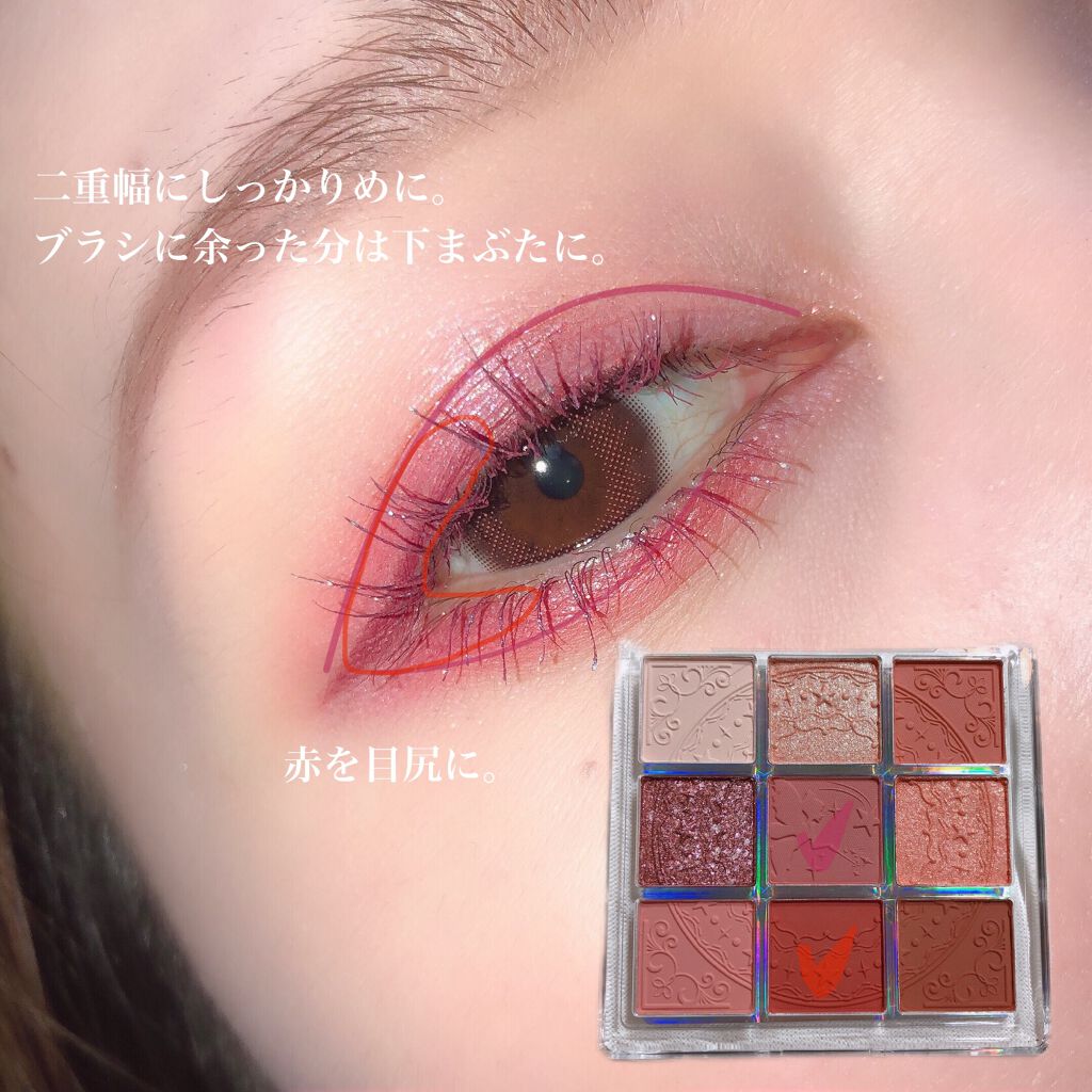 よくパレットのなかで明るいカラーをベースにまぶたに広く塗ることが多いのですが、パール感のあるカラーを避ける🙆♀️! パール感たっぷりの明るいカラーは涙袋に使うぐらい光を集めてぷっくり見せてくれるので、まぶたに広く使うと腫れぼったく見えがち😓 目元を明るくみせてくれたり、次に使うアイシャドウをぼかしやすくしてくれるけど、すっ飛ばしてメインのカラーを塗っちゃう✊🏻❤️🔥 涙袋にはたっぷり塗ってぷっくり見せる🙆♀️💕 シルキースフレアイズのマットタイプはすごく優れているな〜と感じました☺️💗 赤やオレンジなどは、入れすぎると腫れぼったく見えやすいので、見せたいカラーは下まぶた目尻にのせて色をたのしむ♡♡ パール感なしの透けマットだけじゃ物足りない… そう感じさせない華やかなラメが左上に入っているので黒目上と涙袋にのせるとすごく可愛い仕上がりに😍! 厄介な左右差のお陰でマットアイシャドウが好きになりました😌💕