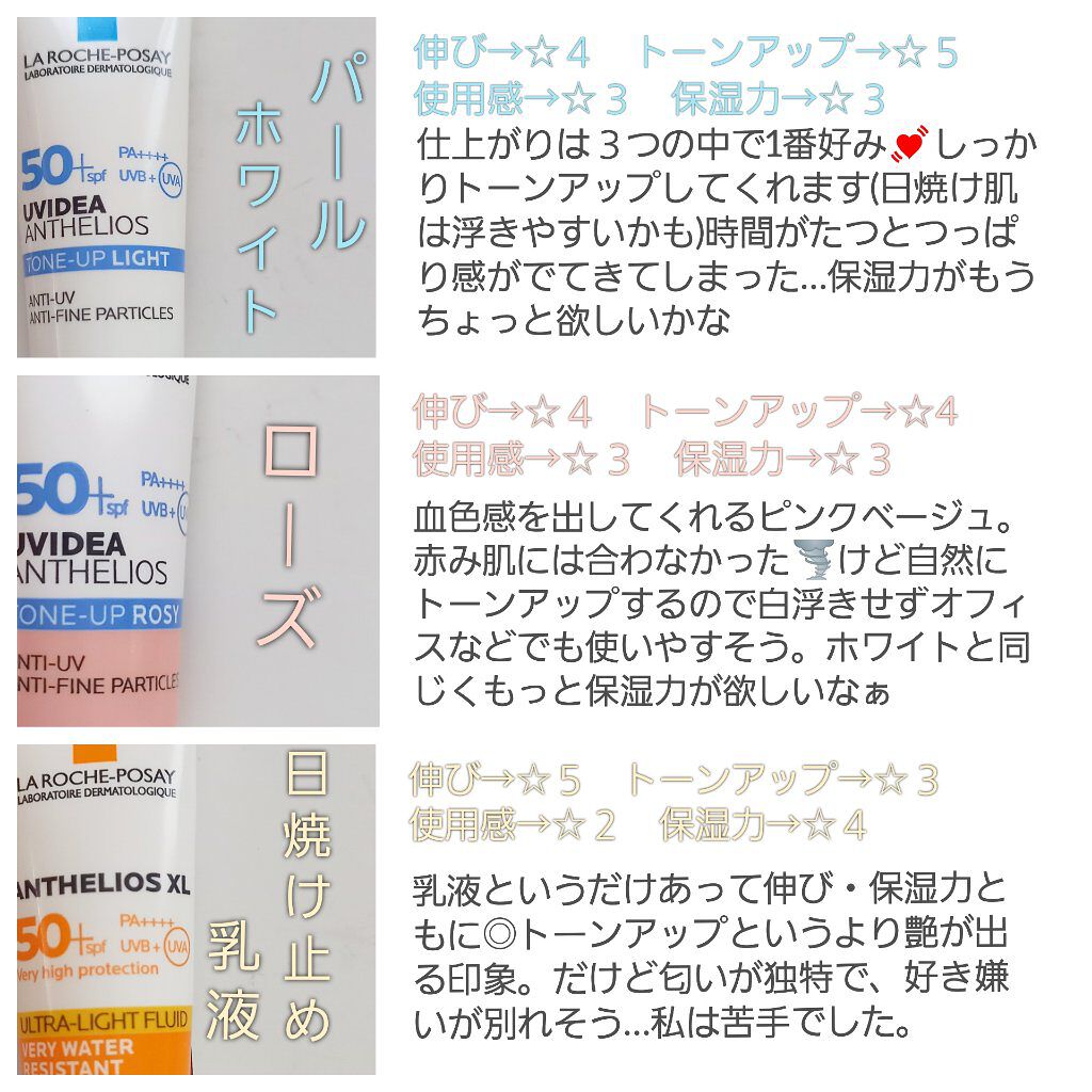 保湿力高めの下地が大好きなのでラロッシュポゼの下地はお気に入りでよく使います✨ かなりトーンアップします🤍自分は肌が黄ぐすみしやすいのでこれくらいトーンアップしてくれた方が時間がたった時にちょうどよくなります✨ 1番のお気に入りはローズです🌹肌から浮かない程よいトーンアップとほんのり血色感がよくなる所が大好きです🥰