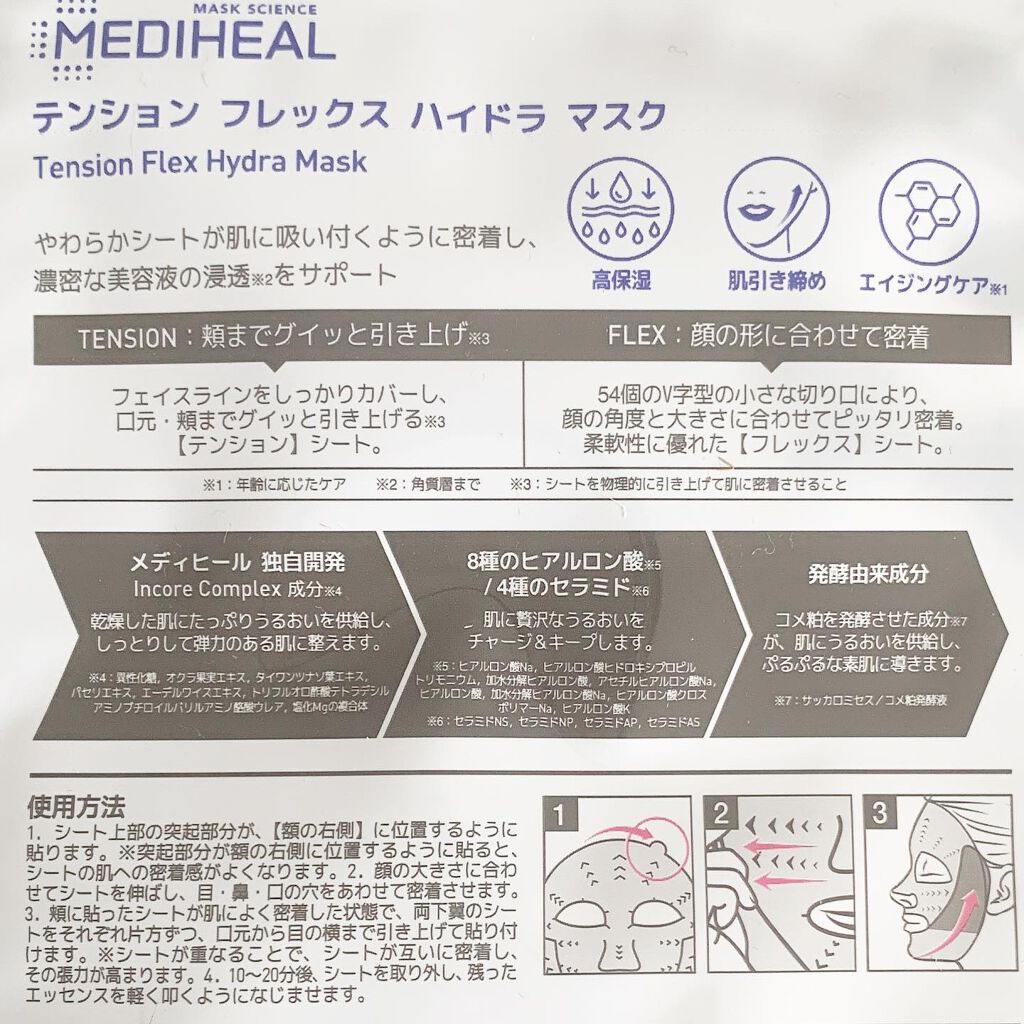 - やわらかシートが肌に吸い付くように密着し、濃厚な美容液の浸透をサポート。 フェイスラインをしっかりカバーし、口元・頬までグイッと引き上げる「テンション」シートと、54個のV字型の小さな切り口により、顔の角度と大きさに合わせてピッタリ密着。 柔軟性に優れた「フレックス」シートの伸縮自在のシートマスク。 メディヒールが独自開発したIncoreComplex成分が乾燥した肌にたっぷりとうるおいを供給し、しっとりして弾力のある肌に整えます。 また、8種のヒアルロン酸・4種のセラミドが肌に贅沢なうるおいをチャージ&キープ。 コメ粕を発酵させた発酵由来成分で、ぷるぷるな素肌に導きます。 内容量:25mL×3枚