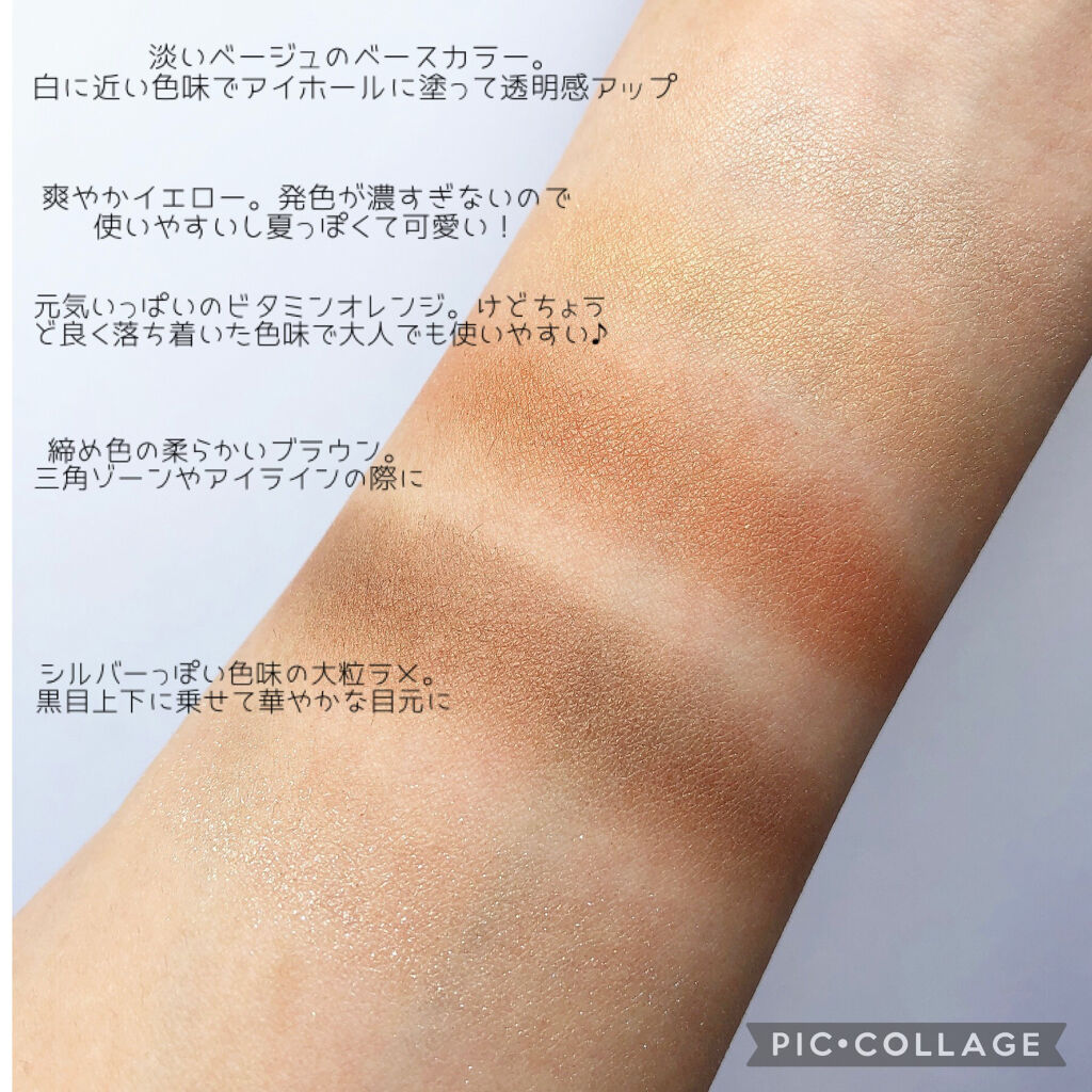 キャンメイクシルキースフレアイズ11ブロッサムシャワー¥825◇質感 4色ともに柔らかくてのびがいいですどのカラーにもたっぷりラメが入っていますが、ラメ飛び、ラメ落ちは気になりませんでした◎ ◇色味 1stブルべ夏/2ndイエベ春 左上→ブル...