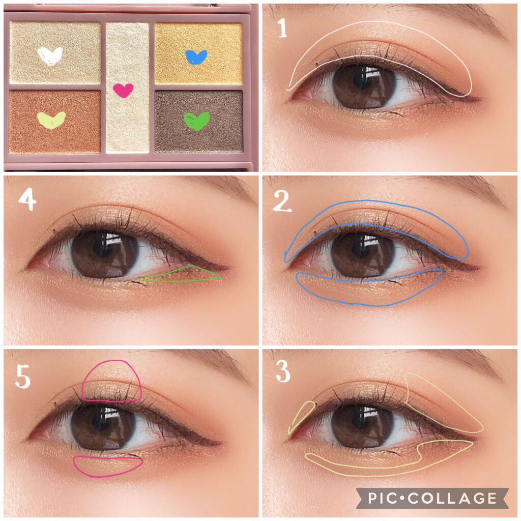 - 1枚のパレットで2つのスタイルが完成! 5色の欲ばりアイシャドウ♥ メインカラーを選んで2つのスタイルが楽しめる! A→B→D でスタイル1 A→C→D でスタイル2 繊細な粉質が、しっとりとまぶたに密着して色落ちを防ぎます。 透明感のあるキラうるトッピングジュエル(繊細ラメ)は、気分によってトッピング!