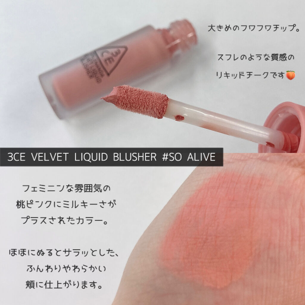 3CE𓎩𓂃ベルベットリキッドブラッシャーsoalive¥1820大好きな3CEのリキッドチーク🍑日本ではSUGAOのコスメがエアリーでこれに近い質感かなと思いますが、スフレのような軽くてふわふわしたリキッドなのに加え、ベルベットのような少しク...