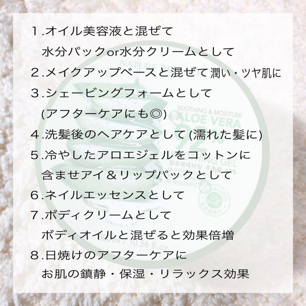 ネイチャーリパブリックマイルド&モイスチャーアロエジェルボトルタイプ310mlネイチャーリパブリックアロエベラ92%スージングジェル基本の使い方としては。。。顔だけでなく、腕・首・脚・背中など全身OKボディローション代わりに(お風呂上がりなど...