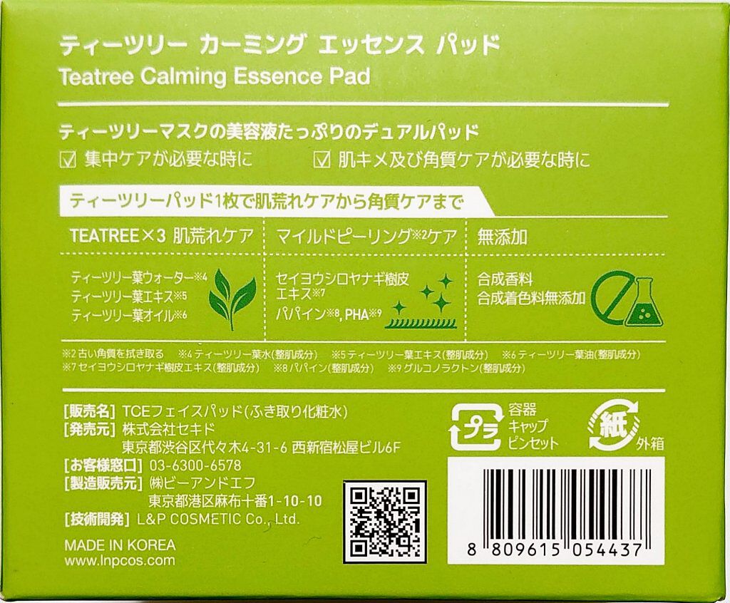 - 肌荒れを予防するティーツリーエッセンス(ティーツリー葉水、ティーツリー葉エキス、ティーツリー葉油の3種類を整肌成分として)を、コットン100%の肌に優しい使い心地のパッドに贅沢にたっぷり配合しております。 片面はエンボスコットン、もう片面がソフトコットンになった「デュアルパッド」になっており、用途に応じての使い分けが可能です。エンボスコットンの面は、手軽に角質・毛穴汚れをオフできる拭き取り化粧水としてお使いいただけます。ソフトコットンの面は、乾燥が気になる部分、肌荒れ予防や集中ケアしたい部分のポイントパックとしてお使いいただけます。 ※2022年9月以降パッケージリニューアル。