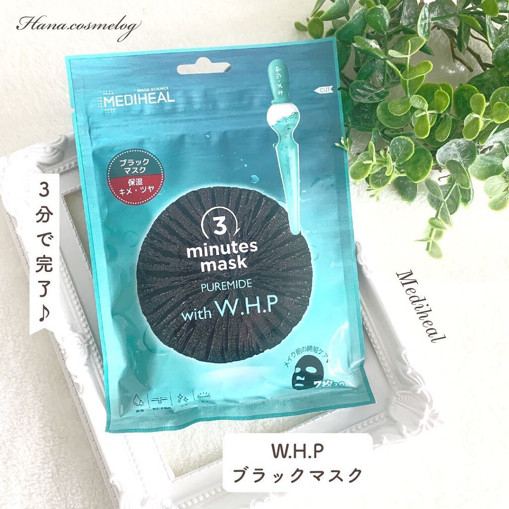 MEDIHEAL3ミニッツマスク:ピュアマイドwithW.H.P黒が印象的なフェイスパック。3分というのが嬉しいですね!化粧水で整えた後に、最高5分までつけてOKみたいです。残った美容液は首につけたり、七枚入りで飽きない。#提供...