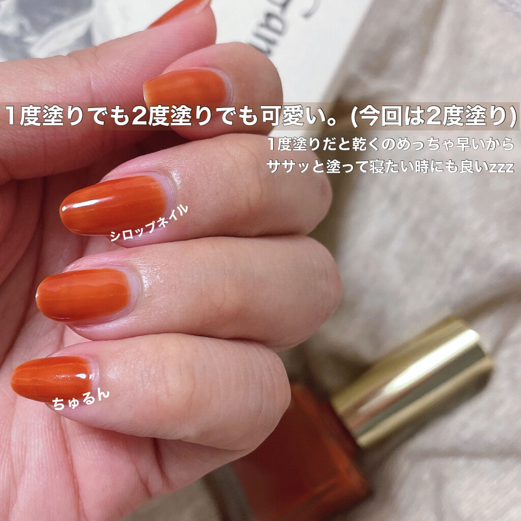 オシャレ感が演出しやすい! 元気が出ます☺️ 一度塗りはフレッシュなオレンジ! 透明感があるので派手さが少しマイルドに♪ 二度塗りはポスターカラーのようなかなりパッキリした色! ほのかに透明感があり