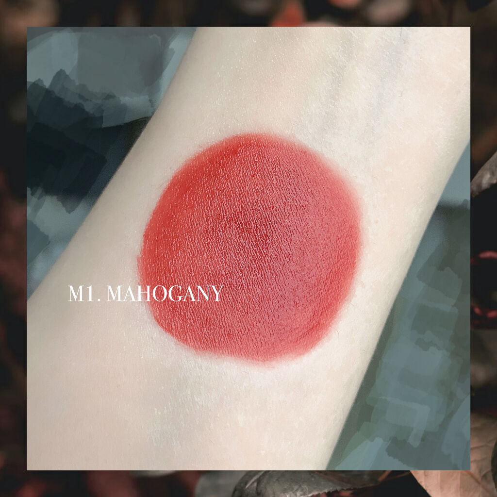 - <M1 マホガニー> ジメチコン、(ジメチコン/ビニルジメチコン)クロスポリマー、水、グリセリン、トリイソステアリン酸ポリグリセリル-2、セチルPEG/PPG-10/1ジメチコン、シクロペンタシロキサン、ペンチレングリコール、メチルトリメチコン、リンゴ酸ジイソステアリル、(アクリル酸ブチル/アクリル酸ヒドロキシプロピルジメチコン)コポリマー、イソドデカン、フェノキシエタノール、トリメチルシロキシケイ酸、(アクリル酸グリセリル/アクリル酸)コポリマー、マイカ、シリカ、ポリプロピルシルセスキオキサン、カプリリルグリコール、1,2-ヘキサンジオール、プロパンジオール、香料、エチルヘキシルグリセリン、水酸化Al、ジメチルシリル化シリカ、ダイウイキョウ果実エキス、メチコン、ヤシ油、アルガニアスピノサ核油、ワサビノキ種子油、シア脂、ハチミツエキス、BG、酸化チタン、酸化鉄、赤104(1)、赤202、黄5、青1 <M2 ジェインチリー> ジメチコン、(ジメチコン/ビニルジメチコン)クロスポリマー、水、グリセリン、トリイソステアリン酸ポリグリセリル-2、セチルPEG/PPG-10/1ジメチコン、シクロペンタシロキサン、ペンチレングリコール、リンゴ酸ジイソステアリル、メチルトリメチコン、(アクリル酸ブチル/アクリル酸ヒドロキシプロピルジメチコン)コポリマー、イソドデカン、フェノキシエタノール、トリメチルシロキシケイ酸、(アクリル酸グリセリル/アクリル酸)コポリマー、マイカ、シリカ、ポリプロピルシルセスキオキサン、カプリリルグリコール、1,2-ヘキサンジオール、香料、プロパンジオール、エチルヘキシルグリセリン、水酸化Al、ジメチルシリル化シリカ、ダイウイキョウ果実エキス、メチコン、ワサビノキ種子油、シア脂、ヤシ油、アルガニアスピノサ核油、ハチミツエキス、BG、酸化チタン、酸化鉄、赤104(1)、赤202、黄4、黄5、青1 <M3 スパイスブリック> ジメチコン、(ジメチコン/ビニルジメチコン)クロスポリマー、水、グリセリン、トリイソステアリン酸ポリグリセリル-2、セチルPEG/PPG-10/1ジメチコン、シクロペンタシロキサン、ペンチレングリコール、メチルトリメチコン、(アクリル酸ブチル/アクリル酸ヒドロキシプロピルジメチコン)コポリマー、イソドデカン、フェノキシエタノール、トリメチルシロキシケイ酸、(アクリル酸グリセリル/アクリル酸)コポリマー、マイカ、シリカ、ポリプロピルシルセスキオキサン、カプリリルグリコール、リンゴ酸ジイソステアリル、1,2-ヘキサンジオール、香料、プロパンジオール、水酸化Al、エチルヘキシルグリセリン、ジメチルシリル化シリカ、ダイウイキョウ果実エキス、メチコン、ワサビノキ種子油、シア脂、ヤシ油、アルガニアスピノサ核油、ハチミツエキス、BG、酸化チタン、酸化鉄、赤104(1)、黄4、黄5 <M4 ビアンローズ> ジメチコン、(ジメチコン/ビニルジメチコン)クロスポリマー、水、グリセリン、セチルPEG/PPG-10/1ジメチコン、トリイソステアリン酸ポリグリセリル-2、シクロペンタシロキサン、リンゴ酸ジイソステアリル、ペンチレングリコール、メチルトリメチコン、(アクリル酸ブチル/アクリル酸ヒドロキシプロピルジメチコン)コポリマー、イソドデカン、フェノキシエタノール、トリメチルシロキシケイ酸、(アクリル酸グリセリル/アクリル酸)コポリマー、マイカ、シリカ、ポリプロピルシルセスキオキサン、カプリリルグリコール、1,2-ヘキサンジオール、香料、プロパンジオール、エチルヘキシルグリセリン、水酸化Al、ジメチルシリル化シリカ、ダイウイキョウ果実エキス、メチコン、ワサビノキ種子油、シア脂、ヤシ油、アルガニアスピノサ核油、ハチミツエキス、BG、酸化チタン、酸化鉄、赤202、赤227、黄4、青1 <M5 ヘイキャンディー> ジメチコン、(ジメチコン/ビニルジメチコン)クロスポリマー、水、グリセリン、トリイソステアリン酸ポリグリセリル-2、セチルPEG/PPG-10/1ジメチコン、シクロペンタシロキサン、ペンチレングリコール、メチルトリメチコン、(アクリル酸ブチル/アクリル酸ヒドロキシプロピルジメチコン)コポリマー、イソドデカン、フェノキシエタノール、トリメチルシロキシケイ酸、リンゴ酸ジイソステアリル、(アクリル酸グリセリル/アクリル酸)コポリマー、マイカ、シリカ、ポリプロピルシルセスキオキサン、カプリリルグリコール、1,2-ヘキサンジオール、プロパンジオール、香料、エチルヘキシルグリセリン、ジメチルシリル化シリカ、ダイウイキョウ果実エキス、メチコン、アルガニアスピノサ核油、シア脂、ヤシ油、ワサビノキ種子油、ハチミツエキス、BG、酸化鉄、赤104(1)、赤202、黄5 <M6 トニールビー> ジメチコン、(ジメチコン/ビニルジメチコン)クロスポリマー、水、グリセリン、トリイソステアリン酸ポリグリセリル-2、セチルPEG/PPG-10/1ジメチコン、シクロペンタシロキサン、ペンチレングリコール、メチルトリメチコン、(アクリル酸ブチル/アクリル酸ヒドロキシプロピルジメチコン)コポリマー、