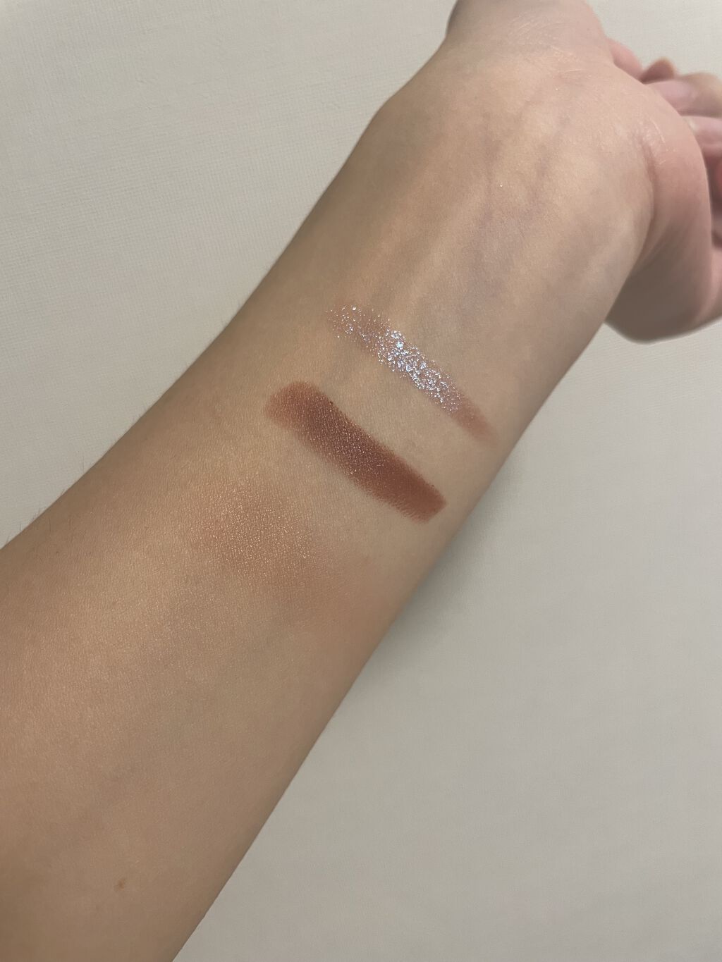 感想を言うと、正直普通のピンクパレットという感じです。 強いて言うなら左上のベースカラー?のラメがキラキラしすぎず地味すぎず絶妙で可愛かったというくらいです。 少し期待しすぎました。何より発色がそんなに良くなかったのが1番残念なポイントでした。 右上のカラーは手に乗せてもあまりわからないくらいなので瞼に乗せてもほとんど色味がわかりません。 右下のカラーは1番濃く発色すると思いきや、クリームタイプなのですが瞼に馴染ませようとするとすぐに薄まってしまっていまいちカラーを出せません。 店頭で見せていただいた際も発色が薄いなと感じましたが、店員さんが目につけているのをみたらはっきり発色だったので濃いめにつければこんな風にできるんだろうと思ったのですが、、、私にはできませんでした、泣 06番は手元でもかなり発色が良かったのでもっとはっきり色が出ると思います。 淡い発色のアイパレットを探している方やピンクパレットを持ってない方にはお勧め出来ますが、もうすでにピンク色のパレットを持っているよという方には強いてお勧めする理由がないです。