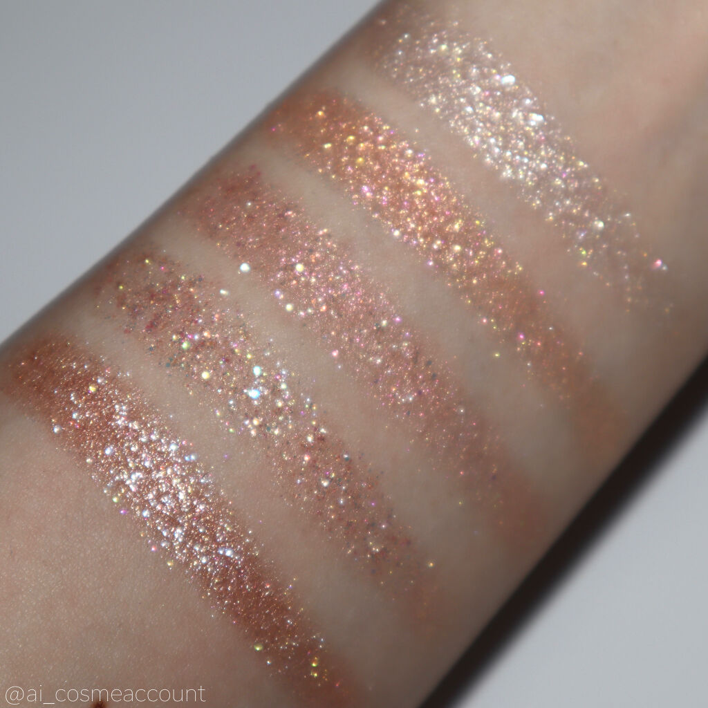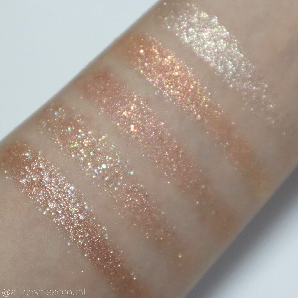 S[SHINY]“高輝度ガラスパール×カラーパールの美しいきらめき”↓S01.ピュアブロンズ“上品に艶めくブロンズゴールド” R[RICH]“リッチな高発色と繊細なツヤで色遊びを楽しめる”↓R01.バニラムスク“光を集めるハイライトベージュ” F[FLUFFY]“ふんわり・しっとりの新感覚 肌と同化するセミマット”↓F01.ラストナイト“血色感を潜ませるメロウなピンク”