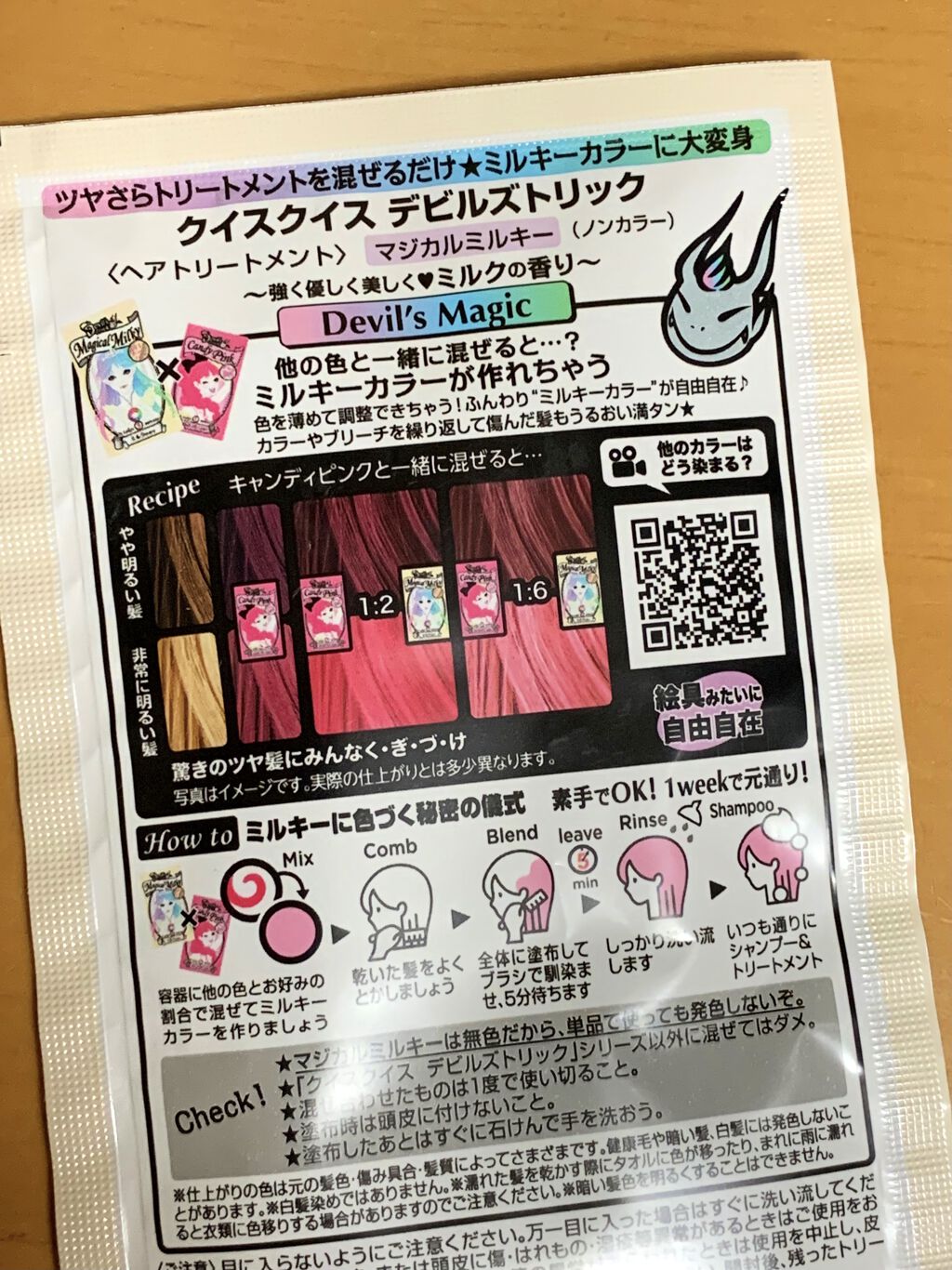 - 傷んだ髪ほどよく染まるヘアカラートリートメントで、“常色"はずれの映え発色! 素手で簡単5分、イオンカラーでツヤさら髪色チェンジ! 約1週間でもとの髪色に戻るから、流行カラーも気軽に試せます。 カラー剤とは思えないフルーツなどの香りで、カラーリング中も楽しめます♪ ※仕上がりの色は元の髪色・傷み具合・髪質によって個人差があります。 ※健康毛や暗い髪・白髪には発色しないことがあります。 <Devil’s 魔法の秘密> ①5分で髪色チェンジ!簡単+イオンカラー® イオン化した+の色素を傷んだ髪に多い-のイオンとくっつけるから発色キレイ♪ 素手でOK! シャンプーすれば1weekで魔法がとけて元通り! ②傷みを集中ケア★ツヤさら髪に変身 保湿成分「ホホバ種子油」「ツバキ種子油」配合で髪にたっぷり潤い満タン。驚きのツヤ髪に! ※頭皮につけないようにご注意ください。 ※素手で塗布したあとはすぐに石けんで手を洗ってください。