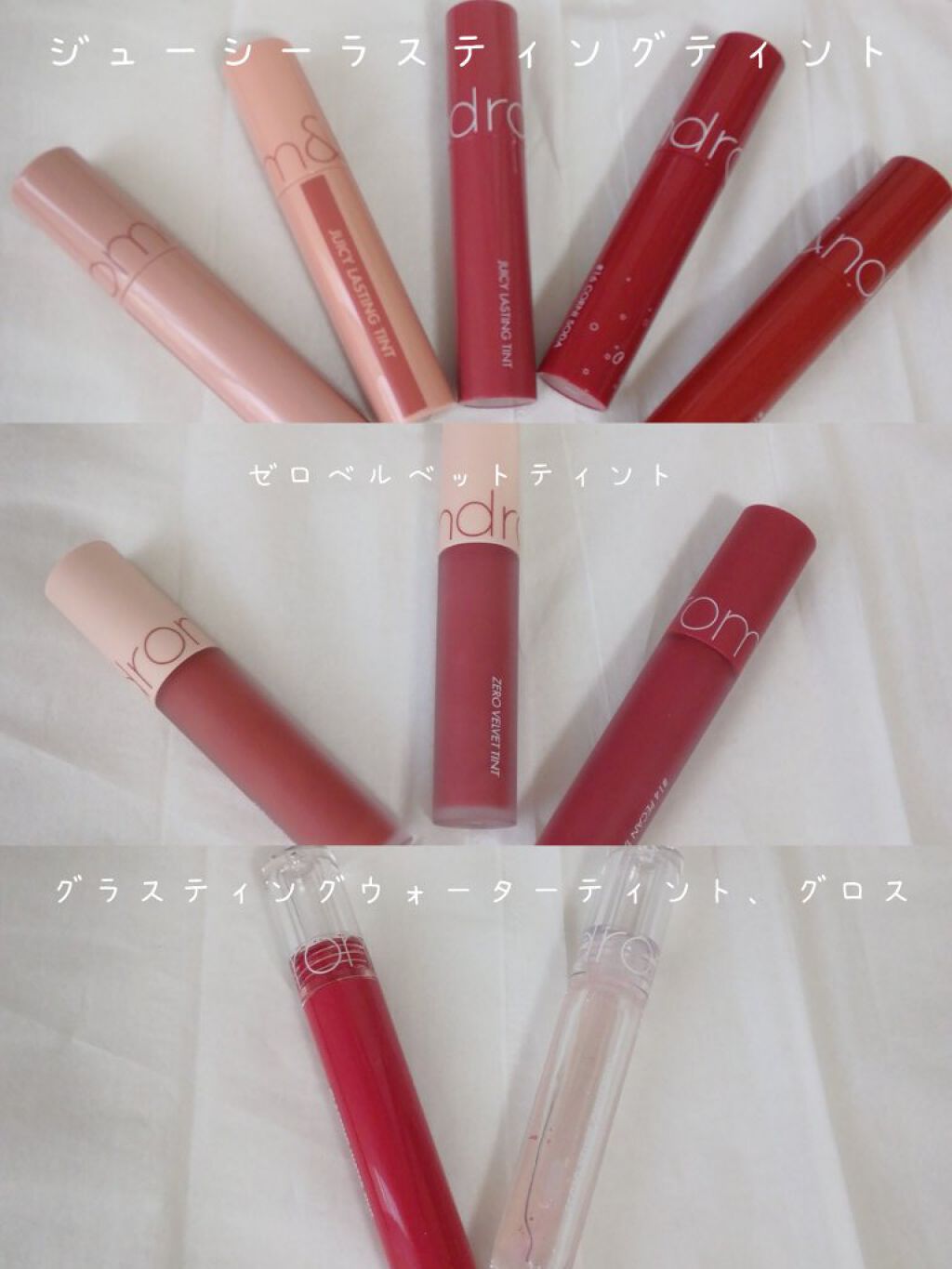 私はいつもrom&ndのジューシーラスティングティントは二度塗りしています! 一度塗りは少しうるうる感があって若干ナチュラルな仕上がり 二度塗りはちゅるちゅる感があって濡れたようなツヤがある ジューシーラスティングティントは二度塗りでもそこまで色が濃くならなくてうるうる感がちゅるちゅる感に進化します(?) rom&ndのティントは絶対んまんましないでください! ツヤが消えてしまいます! グラデリップにするなら容器のふちで調整しながら塗りますっ! これが私のジューシーラスティングティントの塗りかたですっ!