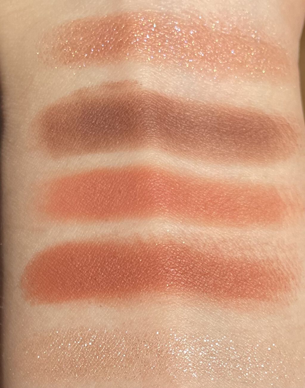 柔らかいピンクブラウンです。本命のブラウンと駆け引きのピンクのハーフみたいで、ナチュラルな陰影を残しつつも、かわいらしいパレットになっています💕 黄土色のマットシャドウに、メタリックなレッドカラー。比較的濃いカラーは無いので、ピンクを締め色としてもかわいい✨ 今回はどちらとも、ハイライトがバームタイプになっています!これからの時期、乾燥しやすいのでめちゃくちゃありがたい、、!