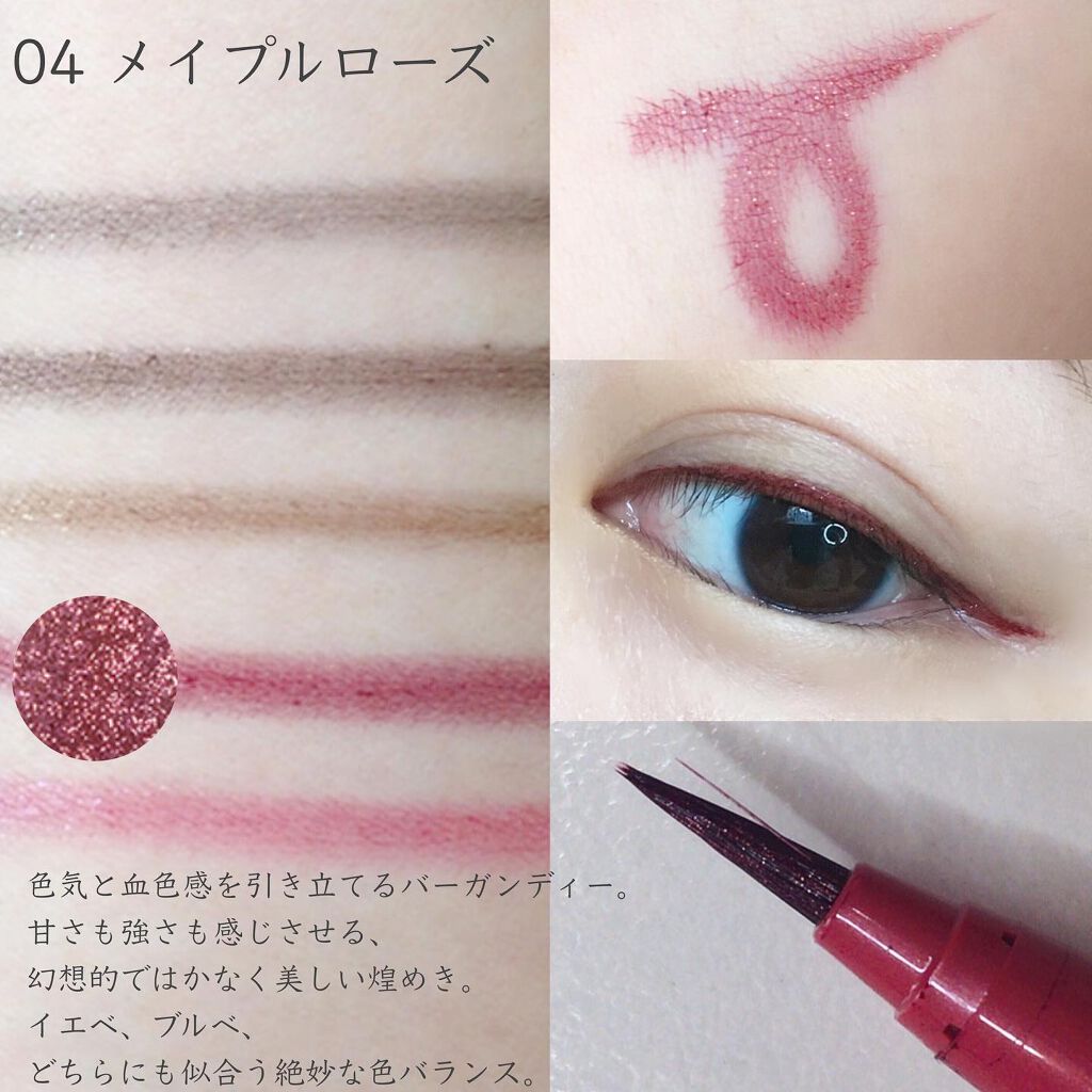- 〇パールなのに落ちにくい!高密着なので水、汗、涙、こすれに強い。 きれいな仕上がりを持続。 〇発色に合わせた筆先を開発。 柔軟性とコシを兼ね備え、どんなラインでもブレずに描けます。 〇速乾性でよれやにじみによるくずれを防止。 〇染料不使用。 〇優れた耐水性なのにお湯+洗顔料でオフ。 (まれにアイシャドウ等と混ざると落ちにくい場合があります。その際はお使いのクレンジング料で落としてください)