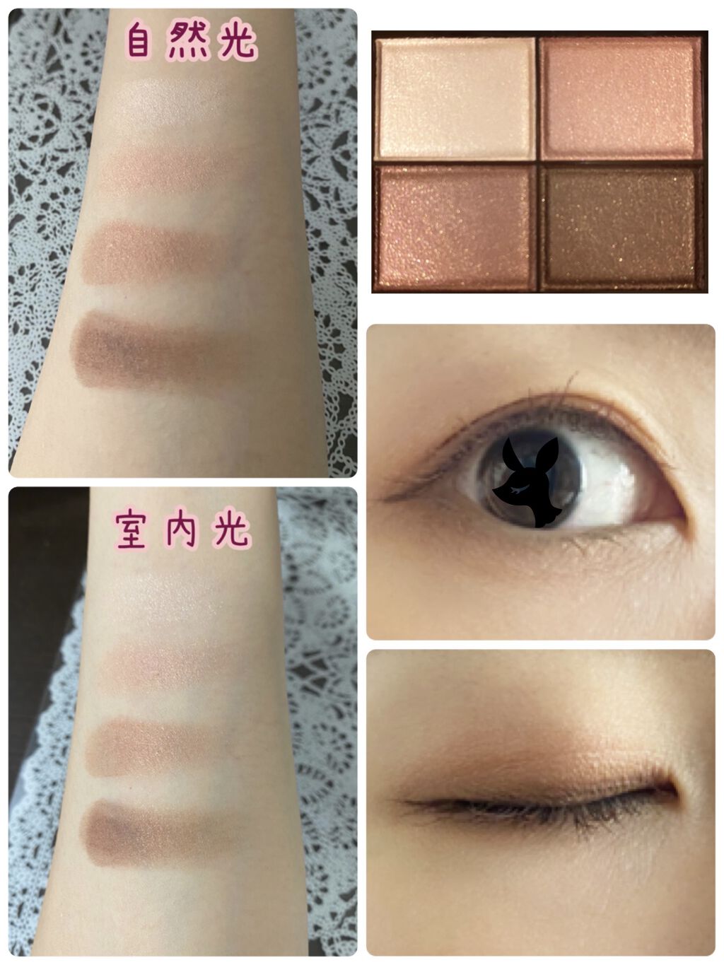 ブラウン、ベージュのみの捨て色なし4色アイシャドウパレットです。 粉質はしっとりしていて発色も良く色持ちもいいです。 仕上がりもナチュラルでオフィスメイクに良さそうです。