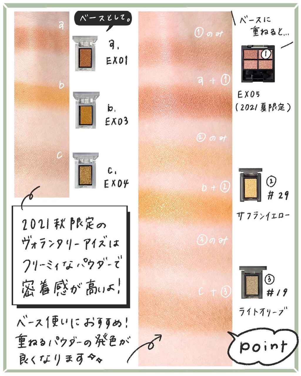 2023年にどどんとリニューアル!全30色展開で新たに発売をスタートしました。 多色パールがこれでもか!ってくらいたっぷり煌めくピンクベージュはほんの少しオレンジのニュアンスも感じられるヘルシーなカラー。 こういうピンクベージュ系の単色シャドウって、ほんとにメイクのベース的に使いやすくて重宝するのよね😚