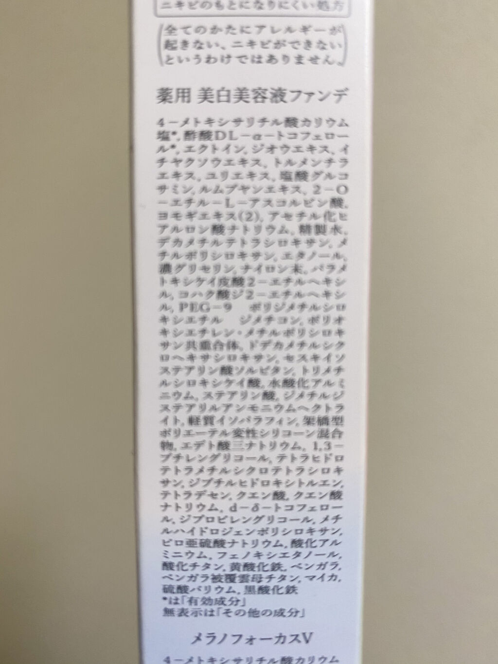- <オークル10> 有効成分 4-メトキシサリチル酸カリウム塩、酢酸DL-α-トコフェロール その他の成分 エクトイン、ジオウエキス、イチヤクソウエキス、トルメンチラエキス、ユリエキス、塩酸グルコ、ミン、ルムプヤンエキス、2-O-エチル-L-アスコルビン酸、ヨモギエキス(2)、アセチル化ヒアルロン酸ナトリウム、精製水、デカメチルテトラシロキサン、メチルポリシロキサン、エタノール、濃グリセリン、ナイロン末、パラメトキシケイ皮酸2-エチルヘキシル、コハク酸ジ2-エチルヘキシル、PEG-9 ポリジメチルシロキシエチル ジメチコン、ポリオキシエチレン・メチルポリシロキサン共重合体、ドデカメチルシクロヘキサシロキサン、セスキイソステアリン酸ソルビタン、トリメチルシロキシケイ酸、水酸化アルミニウム、ステアリン酸、ジメチルジステアリルアンモニウムヘクトライト、軽質イソパラフィン、架橋型ポリエーテル変性シリコーン混合物、エデト酸三ナトリウム、1、3-ブチレングリコール、テトラヒドロテトラメチルシクロテトラシロキサン、ジブチルヒドロキシトルエン、テトラデセン、クエン酸、クエン酸ナトリウム、d-δ-トコフェロール、ジプロピレングリコール、メチルハイドロジェンポリシロキサン、ピロ亜硫酸ナトリウム、酸化アルミニウム、フェノキシエタノール、酸化チタン、黄酸化鉄、ベンガラ、ベンガラ被覆雲母チタン、マイカ、硫酸バリウム、黒酸化鉄 <オークル20> 有効成分 4-メトキシサリチル酸カリウム塩、酢酸DL-α-トコフェロール その他の成分 エクトイン、ジオウエキス、イチヤクソウエキス、トルメンチラエキス、ユリエキス、塩酸グルコサミン、ルムプヤンエキス、2-O-エチル-L-アスコルビン酸、ヨモギエキス(2)、アセチル化ヒアルロン酸ナトリウム、精製水、デカメチルテトラシロキサン、メチルポリシロキサン、エタノール、濃グリセリン、ナイロン末、パラメトキシケイ皮酸2-エチルヘキシル、コハク酸ジ2-エチルヘキシル、PEG-9 ポリジメチルシロキシエチル ジメチコン、ポリオキシエチレン・メチルポリシロキサン共重合体、ドデカメチルシクロヘキサシロキサン、セスキイソステアリン酸ソルビタン、トリメチルシロキシケイ酸、水酸化アルミニウム、ステアリン酸、ジメチルジステアリルアンモニウムヘクトライト、軽質イソパラフィン、架橋型ポリエーテル変性シリコーン混合物、エデト酸三ナトリウム、1,3-ブチレングリコール、テトラヒドロテトラメチルシクロテトラシロキサン、ジブチルヒドロキシトルエン、テトラデセン、クエン酸、クエン酸ナトリウム、d-δ-トコフェロール、ジプロピレングリコール、メチルハイドロジェンポリシロキサン、ピロ亜硫酸ナトリウム、酸化アルミニウム、フェノキシエタノール、酸化チタン、黄酸化鉄、ベンガラ、ベンガラ被覆雲母チタン、マイカ、硫酸バリウム、黒酸化鉄 <オークル30> 有効成分 4-メトキシサリチル酸カリウム塩、酢酸DL-α-トコフェロール その他の成分 エクトイン、ジオウエキス、イチヤクソウエキス、トルメンチラエキス、ユリエキス、塩酸グルコサミン、ルムプヤンエキス、2-O-エチル-L-アスコルビン酸、ヨモギエキス(2)、アセチル化ヒアルロン酸ナトリウム、精製水、デカメチルテトラシロキサン、メチルポリシロキサン、エタノール、濃グリセリン、ナイロン末、パラメトキシケイ皮酸2-エチルヘキシル、コハク酸ジ2-エチルヘキシル、PEG-9 ポリジメチルシロキシエチル ジメチコン、ポリオキシエチレン・メチルポリシロキサン共重合体、ドデカメチルシクロヘキサシロキサン、セスキイソステアリン酸ソルビタン、トリメチルシロキシケイ酸、水酸化アルミニウム、ステアリン酸、ジメチルジステアリルアンモニウムヘクトライト、軽質イソパラフィン、架橋型ポリエーテル変性シリコーン混合物、エデト酸三ナトリウム、1、3-ブチレングリコール、テトラヒドロテトラメチルシクロテトラシロキサン、テトラデセン、ジブチルヒドロキシトルエン、クエン酸、クエン酸ナトリウム、d-δ-トコフェロール、ジプロピレングリコール、メチルハイドロジェンポリシロキサン、ピロ亜硫酸ナトリウム、酸化アルミニウム、フェノキシエタノール、酸化チタン、黄酸化鉄、ベンガラ、ベンガラ被覆雲母チタン、マイカ、硫酸バリウム、黒酸化鉄 <ピンクオークル10> 有効成分 4-メトキシサリチル酸カリウム塩、酢酸DL-α-トコフェロール その他の成分 エクトイン、ジオウエキス、イチヤクソウエキス、トルメンチラエキス、ユリエキス、塩酸グルコサミン、ルムプヤンエキス、2-O-エチル-L-アスコルビン酸、ヨモギエキス(2)、アセチル化ヒアルロン酸ナトリウム、精製水、デカメチルテトラシロキサン、メチルポリシロキサン、エタノール、濃グリセリン、ナイロン末、パラメトキシケイ皮酸2-エチルヘキシル、コハク酸ジ2-エチルヘキシル、PEG-9 ポリジメチルシロキシエチル ジメチコン、ポリオキシエチレン・メチルポリ