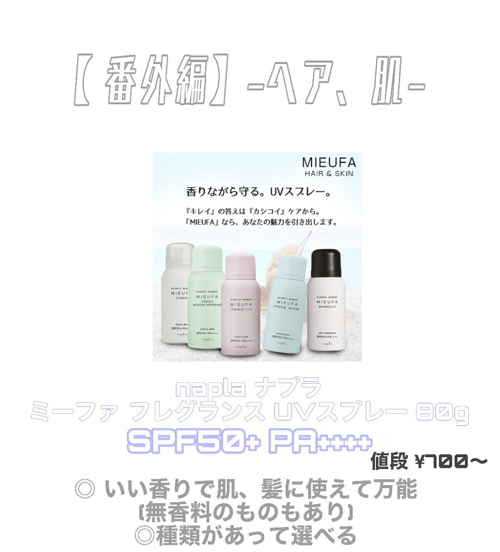 | 日焼け止めミスト・スプレーランキング第39位 | 風が吹いた時にふわっと香るのがとても良い匂いです✨スプレータイプのため、とても軽くほとんど肌に塗った感が無いです。 | 詳細を見る |