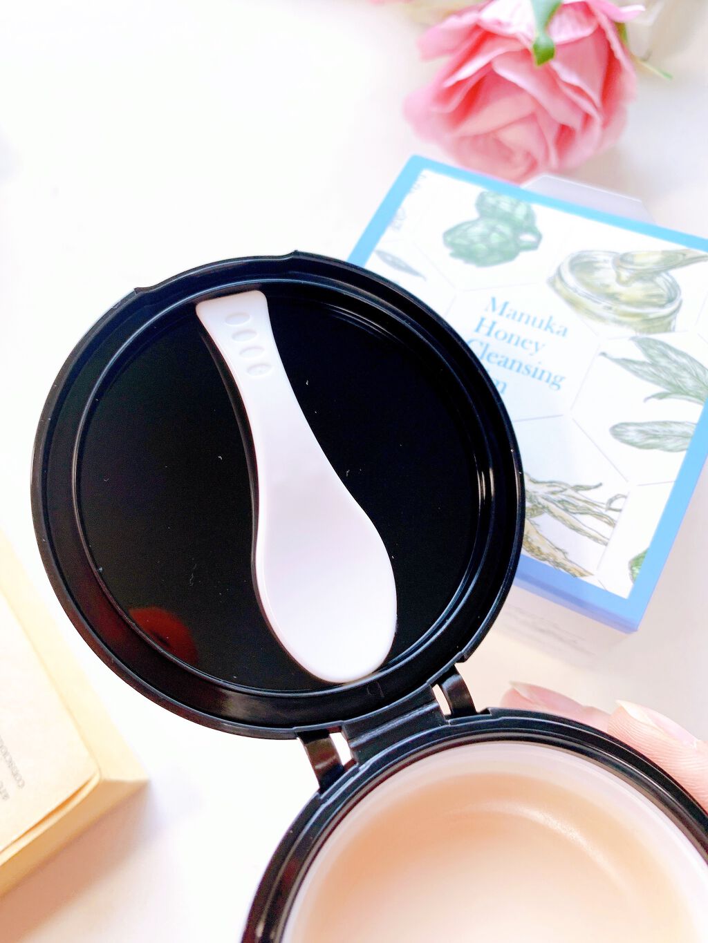 マヌカハニークレンジングバーム🍯.付属のスパチュラでバームを肌にのせて、肌温にとろりととろけるバームは、メイクの上でくるくるするとスルスルメイクと馴染む❤︎.マヌカハニーのおかげか、私は洗い上がりのしっとり感が感じられて満足🫶.抗菌成分を含む...