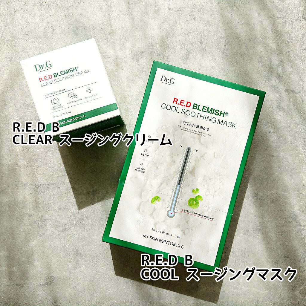 5種類のシカ成分と5種類のヒアルロン酸でお肌をしっとり鎮静して水分ケアまでできちゃうレッドブレミッシュクールスージングマスク🌿 なんといっても特徴的なのがパッケージ!室温、冷蔵、10分冷凍しても使えるんだけど、冷蔵庫にいれておくとパケの温度計の色が青色に変わって、使う時のベストなタイミングを教えてくれるの!😍💕 10種類のCICA成分を配合し、お肌を鎮静!Dr.Gを代表する商品としてとっても人気なレッドブレミッシュクリアスージングクリーム🥀