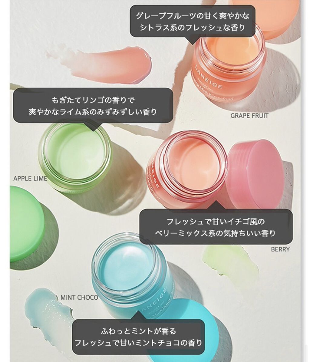 - 寝ている間にケアしてふっくらぷるぷるにうるおった唇へ。 2015年の初代発売以降、世界で2秒に1個売れている*¹LANEIGE大ヒットシリーズ *¹ 2024年グローバル販売実績 1.角質にアプローチするBerryFruitComplex (ベリーフルーツコンプレックス)*²が、 寝ている間に気になる乾燥や角質にうるおいを与え、つやのあるふっくらとうるおった唇に仕上げます。 *²ザクロ果実エキス、ブドウ果実エキス、ラズベリー果実エキス 2.ココナッツオイル(ヤシ油)を配合で、うるおいをあたえ睡眠中の乾燥を防ぎます。 3.今夜はどんな気分?5つのフレーバーから選べるワクワク感。 ■テクスチャー:やさしく馴染むなめらかなバームタイプ ■アレルギーテスト済み*³ *³全ての方にアレルギーが起こらないということではありません。 ■使用方法 寝る前に唇にたっぷり塗り、そのままお休みください。 翌朝、軽くティッシュオフします。付属のスパチュラで塗ることで、より唇の角質に馴染みやすくなります。 日中のリップトリートメントにも使用できます。