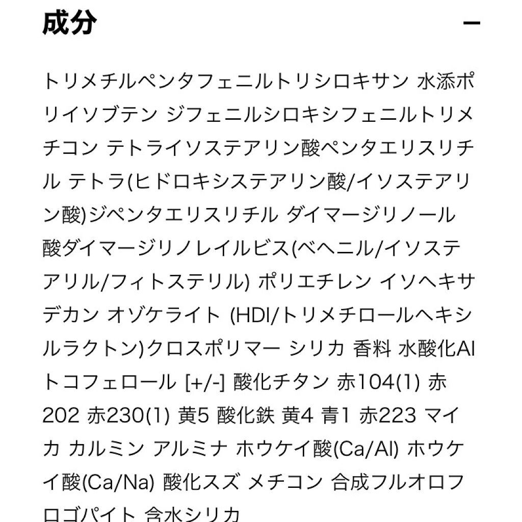 - <924 スターギャラクシー> トリメチルペンタフェニルトリシロキサン、水添ポリイソブテン、ジフェニルシロキシフェニルトリメチコン、テトライソステアリン酸ペンタエリスリチル、テトラ(ヒドロキシステアリン酸/イソステアリン酸)ジペンタエリスリチル、ダイマージリノール酸ダイマージリノレイルビス(ベヘニル/イソステアリル/フィトステリル)、ポリエチレン、イソヘキサデカン、オゾケライト、(HDI/トリメチロールヘキシルラクトン)クロスポリマー、シリカ、香料、トコフェロール、[+/-]、酸化チタン、赤104(1)、赤202、赤230(1)、黄5、酸化鉄、マイカ、黄4、赤223、青1、コンジョウ、カルミン、アルミナ、ホウケイ酸(Ca/Al)、ホウケイ酸(Ca/Na)、酸化スズ、メチコン、合成フルオロフロゴパイト、水酸化Al、含水シリカ、ケイ酸Mg <930 スイートセント> トリメチルペンタフェニルトリシロキサン、水添ポリイソブテン、ジフェニルシロキシフェニルトリメチコン、テトライソステアリン酸ペンタエリスリチル、テトラ(ヒドロキシステアリン酸/イソステアリン酸)ジペンタエリスリチル、ダイマージリノール酸ダイマージリノレイルビス(ベヘニル/イソステアリル/フィトステリル)、ポリエチレン、イソヘキサデカン、(HDI/トリメチロールヘキシルラクトン)クロスポリマー、パラフィン、マイクロクリスタリンワックス、合成ワックス、シリカ、香料、トコフェロール、[+/-]、酸化チタン、赤104(1)、赤202、赤230(1)、黄5、酸化鉄、マイカ、黄4、赤223、青1、コンジョウ、カルミン、アルミナ、ホウケイ酸(Ca/Al)、ホウケイ酸(Ca/Na)、酸化スズ、メチコン、合成フルオロフロゴパイト、水酸化Al、含水シリカ、ケイ酸Mg <931 ミスチヴァス> トリメチルペンタフェニルトリシロキサン、水添ポリイソブテン、ジフェニルシロキシフェニルトリメチコン、テトライソステアリン酸ペンタエリスリチル、テトラ(ヒドロキシステアリン酸/イソステアリン酸)ジペンタエリスリチル、ダイマージリノール酸ダイマージリノレイルビス(ベヘニル/イソステアリル/フィトステリル)、ポリエチレン、イソヘキサデカン、(HDI/トリメチロールヘキシルラクトン)クロスポリマー、パラフィン、マイクロクリスタリンワックス、合成ワックス、シリカ、香料、トコフェロール、[+/-]、酸化チタン、赤104(1)、赤202、赤230(1)、黄5、酸化鉄、マイカ、黄4、赤223、青1、コンジョウ、カルミン、アルミナ、ホウケイ酸(Ca/Al)、ホウケイ酸(Ca/Na)、酸化スズ、メチコン、合成フルオロフロゴパイト、水酸化Al、含水シリカ、ケイ酸Mg <932 ビターネクター> トリメチルペンタフェニルトリシロキサン、水添ポリイソブテン、ジフェニルシロキシフェニルトリメチコン、テトライソステアリン酸ペンタエリスリチル、テトラ(ヒドロキシステアリン酸/イソステアリン酸)ジペンタエリスリチル、ダイマージリノール酸ダイマージリノレイルビス(ベヘニル/イソステアリル/フィトステリル)、ポリエチレン、イソヘキサデカン、(HDI/トリメチロールヘキシルラクトン)クロスポリマー、パラフィン、マイクロクリスタリンワックス、合成ワックス、シリカ、香料、トコフェロール、[+/-]、酸化チタン、赤104(1)、赤202、赤230(1)、黄5、酸化鉄、マイカ、黄4、赤223、青1、コンジョウ、カルミン、アルミナ、ホウケイ酸(Ca/Al)、ホウケイ酸(Ca/Na)、酸化スズ、メチコン、合成フルオロフロゴパイト、水酸化Al、含水シリカ、ケイ酸Mg <934 ライプデライト> トリメチルペンタフェニルトリシロキサン、水添ポリイソブテン、ジフェニルシロキシフェニルトリメチコン、テトライソステアリン酸ペンタエリスリチル、テトラ(ヒドロキシステアリン酸/イソステアリン酸)ジペンタエリスリチル、ダイマージリノール酸ダイマージリノレイルビス(ベヘニル/イソステアリル/フィトステリル)、ポリエチレン、イソヘキサデカン、(HDI/トリメチロールヘキシルラクトン)クロスポリマー、パラフィン、マイクロクリスタリンワックス、合成ワックス、シリカ、香料、トコフェロール、[+/-]、酸化チタン、赤104(1)、赤202、赤230(1)、黄5、酸化鉄、マイカ、黄4、赤223、青1、コンジョウ、カルミン、アルミナ、ホウケイ酸(Ca/Al)、ホウケイ酸(Ca/Na)、酸化スズ、メチコン、合成フルオロフロゴパイト、水酸化Al、含水シリカ、ケイ酸Mg <951 サングリア> トリメチルペンタフェニルトリシロキサン、水添ポリイソブテン、ジフェニルシロキシフェニルトリメチコン、テトライソステアリン酸ペンタエリスリチル、テトラ(ヒドロキシステアリン酸/イソステアリン酸)ジペンタエリスリチル、ダイマージリノール酸ダイマージリノレイルビス(ベヘニル/イソステアリル/フィトステリル)、ポリエチレン、イソヘキサデカン、(HDI/トリメチロールヘキシルラクトン)クロスポリマー、パラフィン、マイクロクリスタリンワックス、合成ワックス、シリカ、香料、トコフェロール、[+/-]、酸化チタン、赤104(1)、赤202、赤230(1)、黄5、酸化鉄、マイカ、黄4、赤223、青1