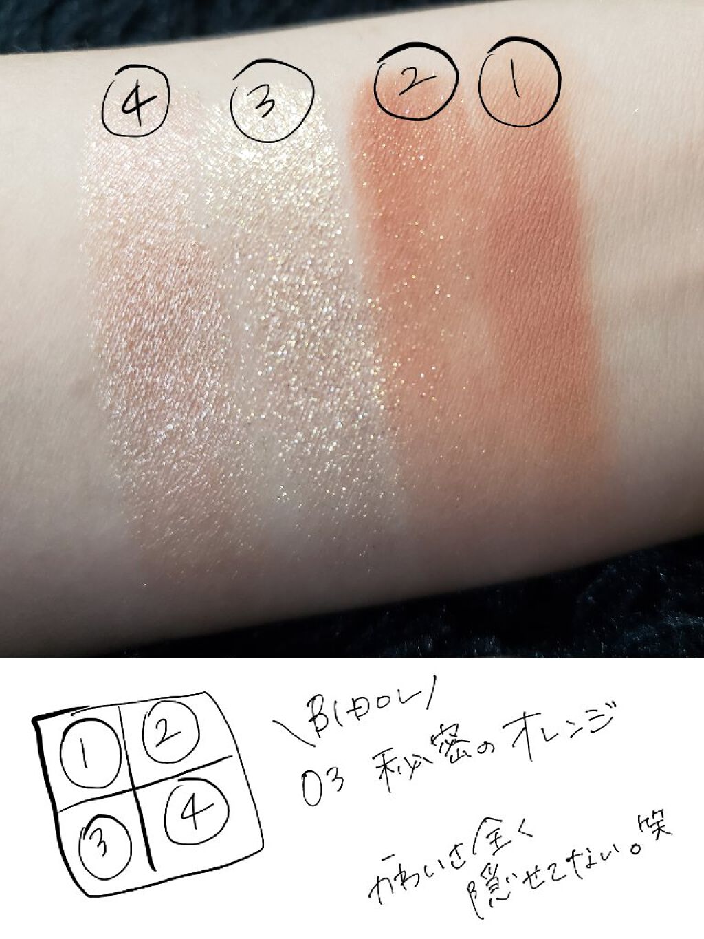 緋影は、右上アイホール左下二重幅+下まぶた 明雫は、下まぶた 宵雫は、目頭と黒目上 これめちゃくちゃ可愛いです!顔に秋が来てたまらんです!! 明雫と宵雫のたっぷりラメをとてもよく生かせてると思う(自画自賛メイク)限定なのほんともったいない体操。