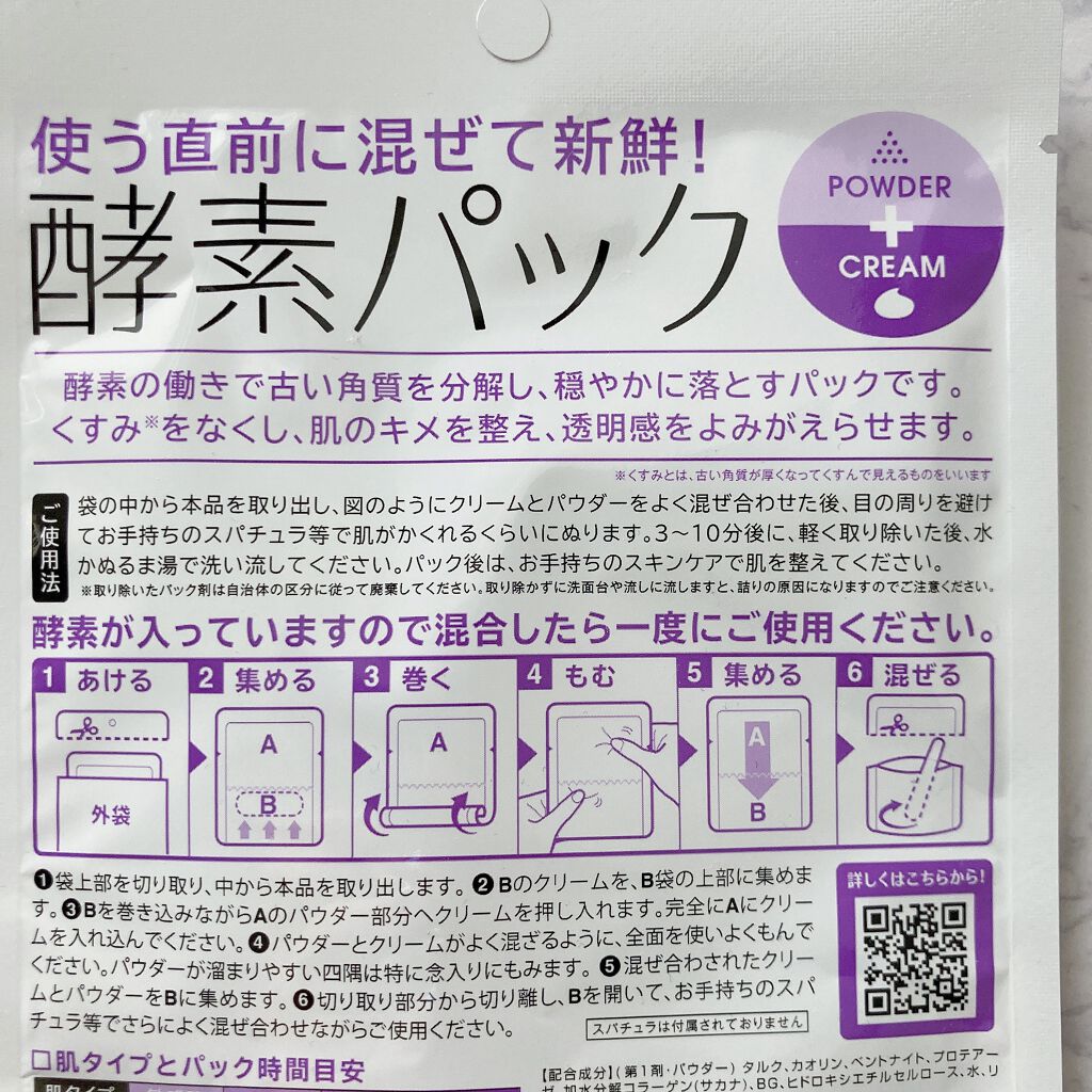 - 酵素の働きで古い角質を穏やかな使い心地で落とすパックです。くすみ*をケアし、お肌のキメを整え、透明感のある肌に導きます。 計量いらずの普通肌1 回分の使い切り分包タイプです。 *古い角質や汚れによる