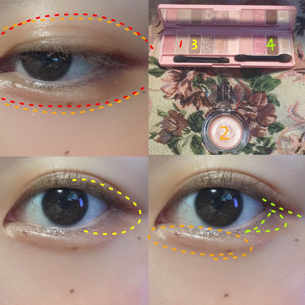 メインのピンクカラーは腫れぼったく見えないように上瞼の外側から三角ゾーンと涙袋の影を作るように塗りました! ラメはピンク系の色にすることでアイシャドウの色と合うようにしました😍 アイラインは少しだけ跳ね上げ風にすると甘すぎない印象で可愛いです💕
