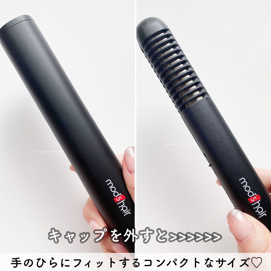 オシャレなデザインになってリニューアル🙌🏻✨ モバイルバッテリーと繋げば、いつでもどこでもスタイリングできちゃう💕 手のひらサイズのコンパクトさでかなり軽い!使用後に収納できるキャップ付きで持ち運びにも便利でかなり有り難い🥹 ピタッと挟めるクッションプレートで軽い力でもしっかり挟めるし、前髪・毛先・顔周りなどのポイントセットやショートの方なら全体にも使いやすいし、メンズのヘアセットにもおすすめ🙆♀️
