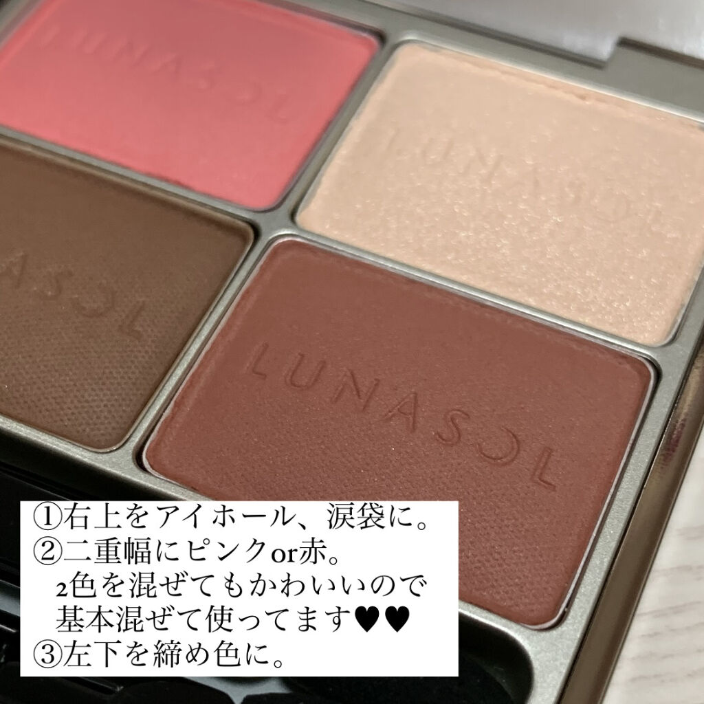 LUNASOLのアイシャドウパレットです❁⃘*.゚ ベージュ系の色味の中にオレンジが入っていて目元が暗くなりすぎず使いやすいです♪ 全てパール質感になっていて綺麗なツヤ感も出ます。 ブラウンすぎると目元が重たく見えるのでこのオレンジが入っているカラーだと明るく見えてよかったです!