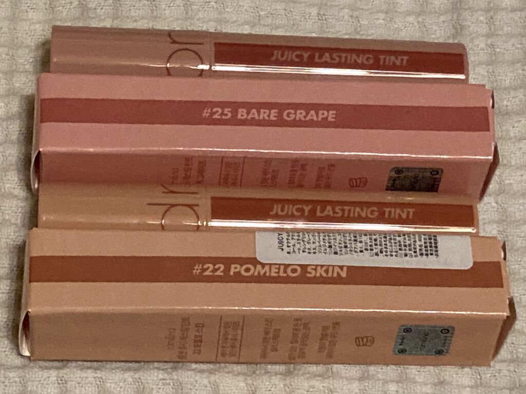 クールトーンのピンクベージュカラー 私の肌や唇だと青みと赤みのあるピンクベージュに発色しました。ブルベさんが得意そうな色。ツヤが可愛い💕 私はイエベですが、透け感があるから薄く塗れば使えるかなと思いました。 ジューシーラスティングティントは香りが強めなイメージだったから使ったことなかったけど、塗って時間をおけばそんなに気にならなかったから、リニュ後の買ってみようかな🫶
