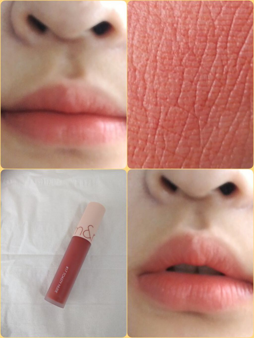 私はいつもrom&ndのジューシーラスティングティントは二度塗りしています! 一度塗りは少しうるうる感があって若干ナチュラルな仕上がり 二度塗りはちゅるちゅる感があって濡れたようなツヤがある ジューシーラスティングティントは二度塗りでもそこまで色が濃くならなくてうるうる感がちゅるちゅる感に進化します(?) rom&ndのティントは絶対んまんましないでください! ツヤが消えてしまいます! グラデリップにするなら容器のふちで調整しながら塗りますっ! これが私のジューシーラスティングティントの塗りかたですっ!