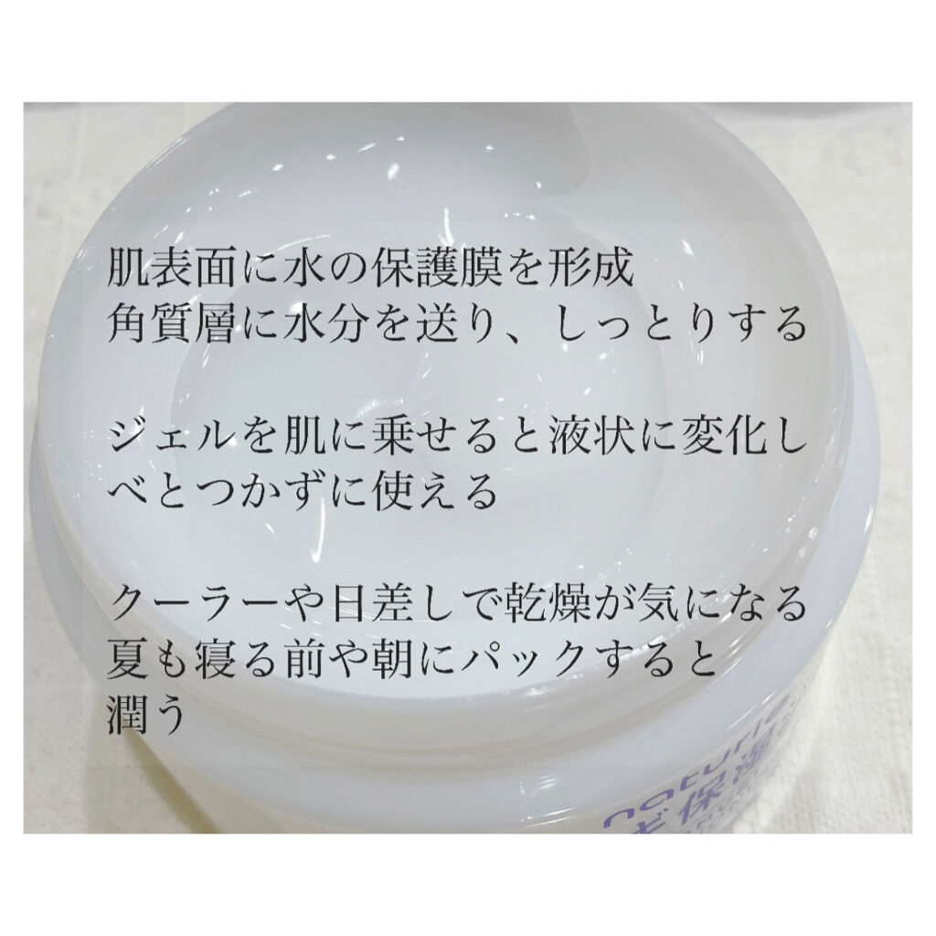- 肌にうるおいを与えてスキンコンディションを整える、 天然保湿成分ハトムギエキス配合の保湿ジェルです。 ジェルを肌にのせると液状に変化して、肌表面に「水の保護膜」を形成。 継続的に角質層に水分を送りこむので、うるおいに満ちた肌が続きます。 油分を抑えたみずみずしい使用感でべたつきが気になりません。 基本は化粧水の後にたっぷり使ってください。 メイク前の保湿やお風呂上がりの「とりあえず保湿」、ボディにも。 ●使用方法 ■基本は、化粧水の後に美容液として 化粧水の後にたっぷり使ってください。 500円玉大の量を2回重ねづけするのが目安です。 その後、お好みで乳液やクリームを重ねてください。 ■乳液やクリームのべたつきが気になるときに 水の保護膜でうるおいをキープし、べたつきません。 ■メイク前の保湿ケアに 油分の多いスキンケア品を使うとメイクがくずれやすいときは、 メイク前の保湿ケアとしてもお使いいただけます。 油分に頼らず肌のうるおいを守り、ヨレやくずれを防ぎます。 ■お風呂上がりの「とりあえず保湿」に ゆっくりスキンケアができないときは、 素肌に直接なじませて乾燥から肌を守ります。 油分が少ないので、後から行うスキンケアの浸透(※)を妨げません。 ※角質層まで ■ジェルパックでさらにうるおい 特に乾燥が気になるときは、 500円玉大3枚程度の量を顔全体にのせて 約5分間経ってから、肌になじませてください。 ■おやすみ前の「重ねづけ保湿」に 500円玉大の量のジェルをもう一度なじませることで、 睡眠中の乾燥を防ぎます。 ■ボディにも べたつかないので、毎日の入浴後や日差しを浴びた後などの ボディのスキンケアにもおすすめです。