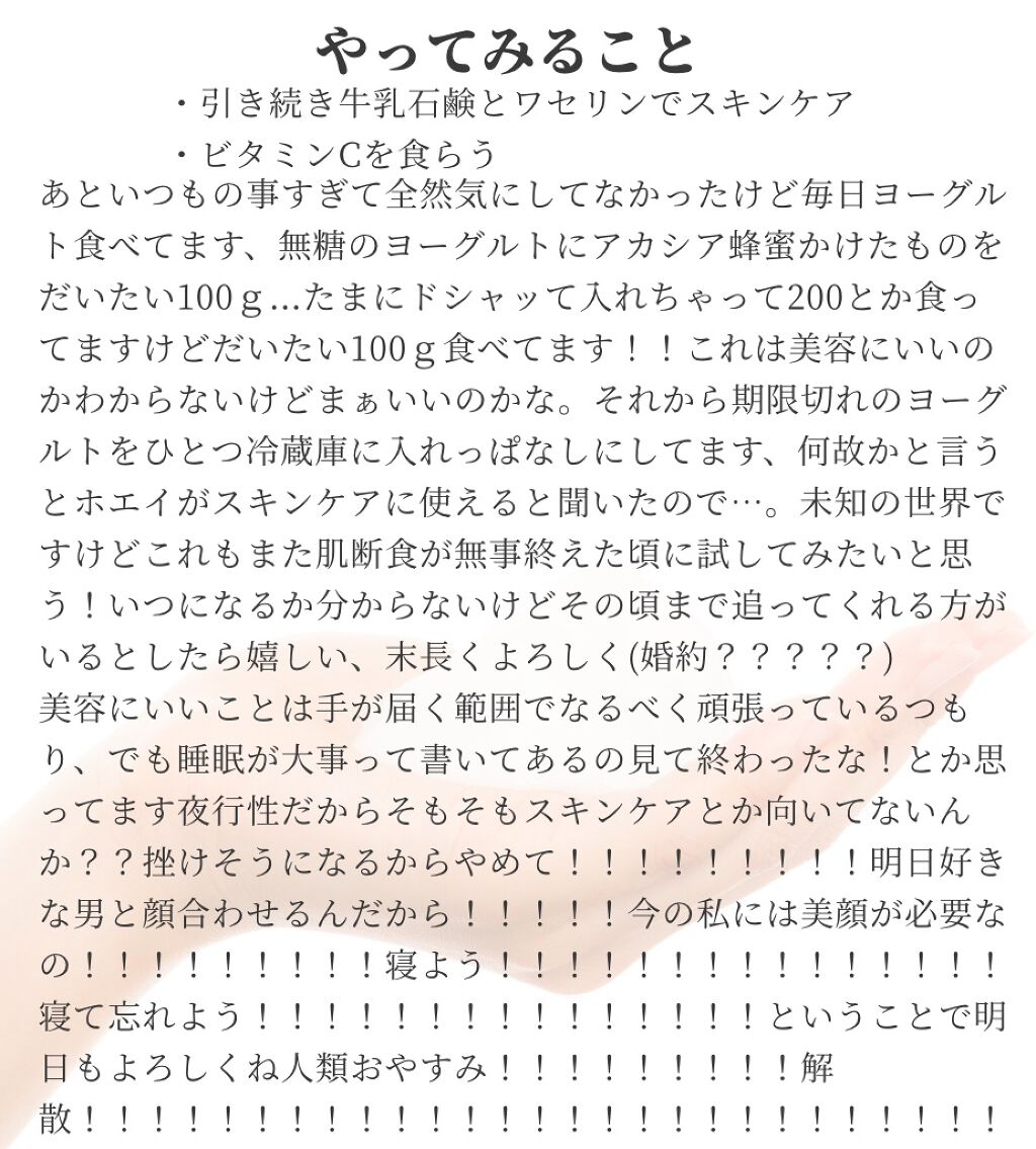 こんばんは、引き続き話すことないですが肌の経過とメモ!どうでもいいけどヨーグルトがちゃんと商品として追加できるのびっくりしちゃったいやあるんか〜〜い!と思って一人で笑ってます虚しい!!無糖が好きです!!蜂蜜が美味しいので!!蜂蜜が好きなので!...