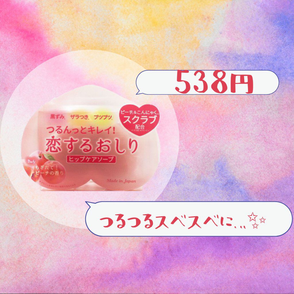 - 恋するおしり ヒップケアソープ おしりの黒ずみ・ザラつき・ブツブツにくるくる直接洗いの簡単ケア! (1)余分な古い角質を落とす:角質ケア スクラブ※1&ピーリング成分※2配合 【モモ核、マンナン※1 グルコノバクター/ハチミツ発酵液、 リンゴ酸・乳酸・クエン酸※2】 (2)必要なうるおいを守る:保湿ケア 6種※3の美容保湿エッセンスを配合 【モモ葉エキス、モモ種子エキス、ビワ葉エキス、キウイエキス、 アーチチョーク葉エキス、アロエベラ液汁※3】 ◎「きゅんっ」とする もぎたて!ピーチの香り