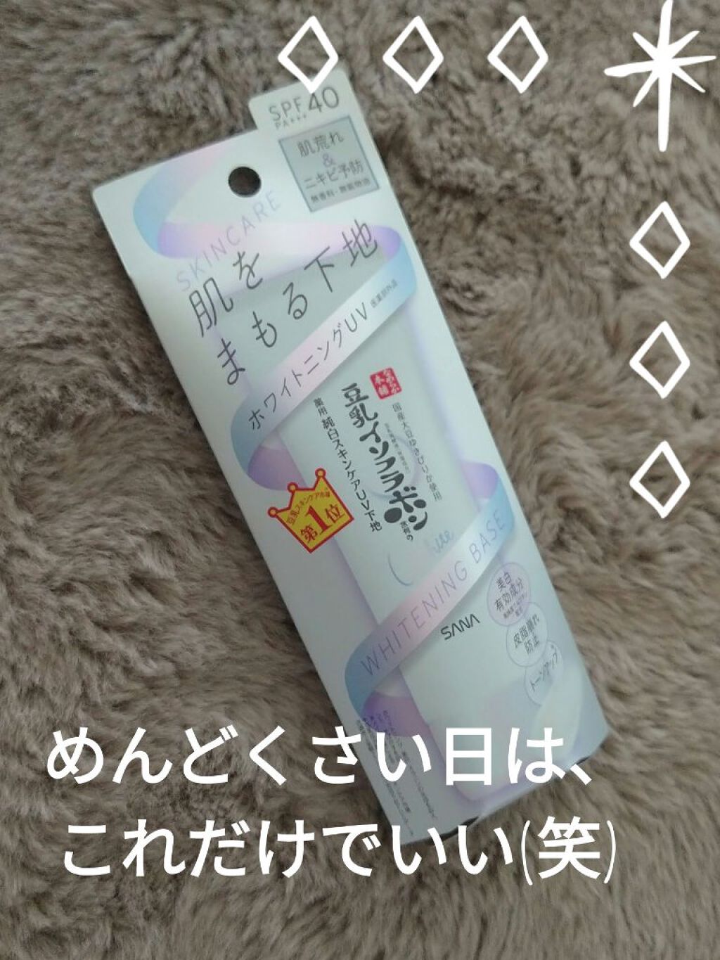 - <薬用美白スキンケアUV下地> 豆乳の美白スキンケアUV下地。肌荒れ&ニキビ予防しながら美白!メラニンの生成を抑え、シミ・そばかすを防ぎます。トーンアップ(メイク効果による)&皮脂崩れ防止。化粧水・美容液・乳液・クリーム・UVカット・化粧下地の1本6役。SPF40・PA+++。[販売名:サナ なめらか本舗 薬用美白スキンケアUV下地]
