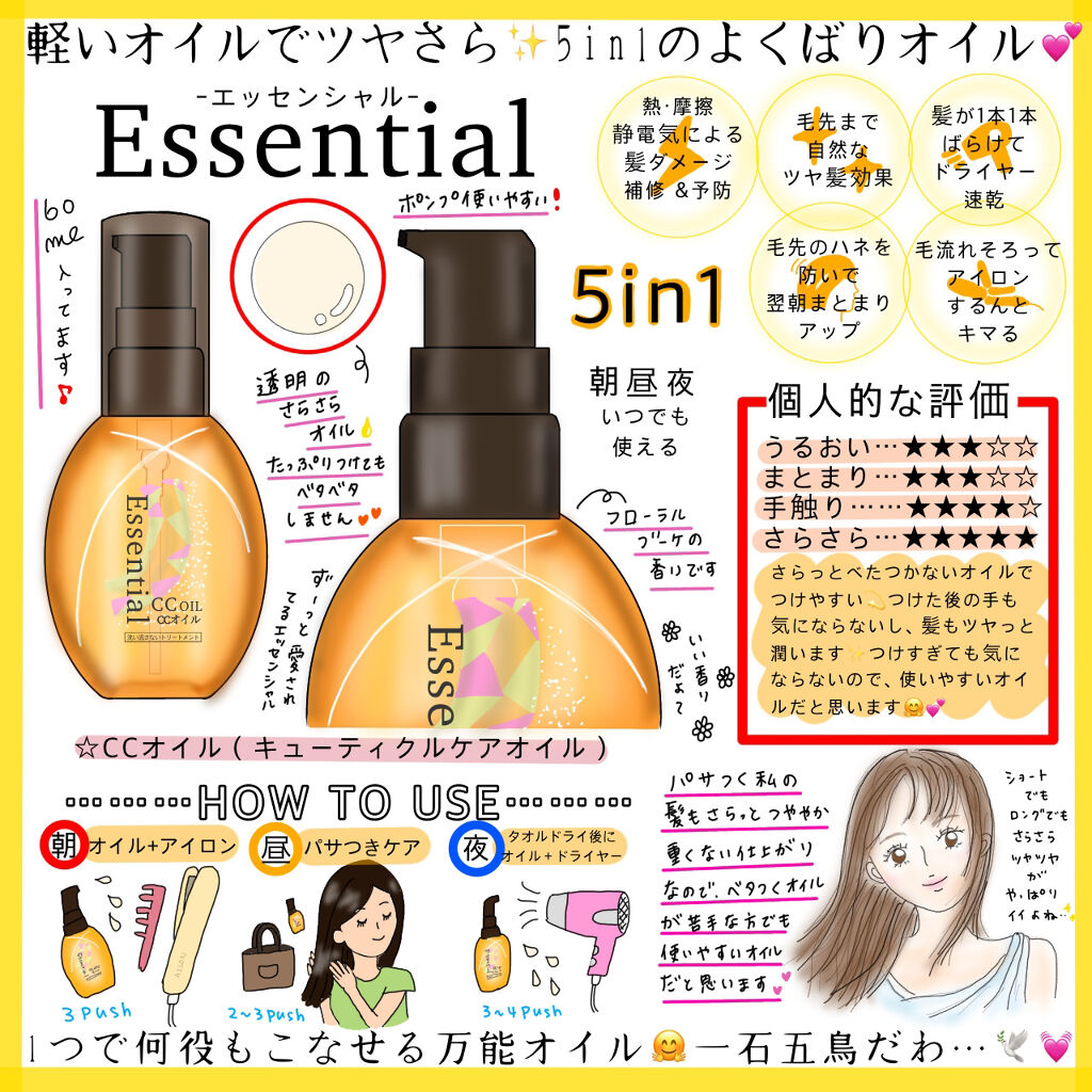 乾燥知らずのサラ艶髪へ!キューティクルケアオイル✨花王エッセンシャルCCオイル濡れた髪にも乾いた髪にも朝昼夜使えちゃう万能オイル!ダメージケアはもちろん、1本で様々な効果が期待されます。オイルなのにベタつかないのが本当にポイント高いです!画像...