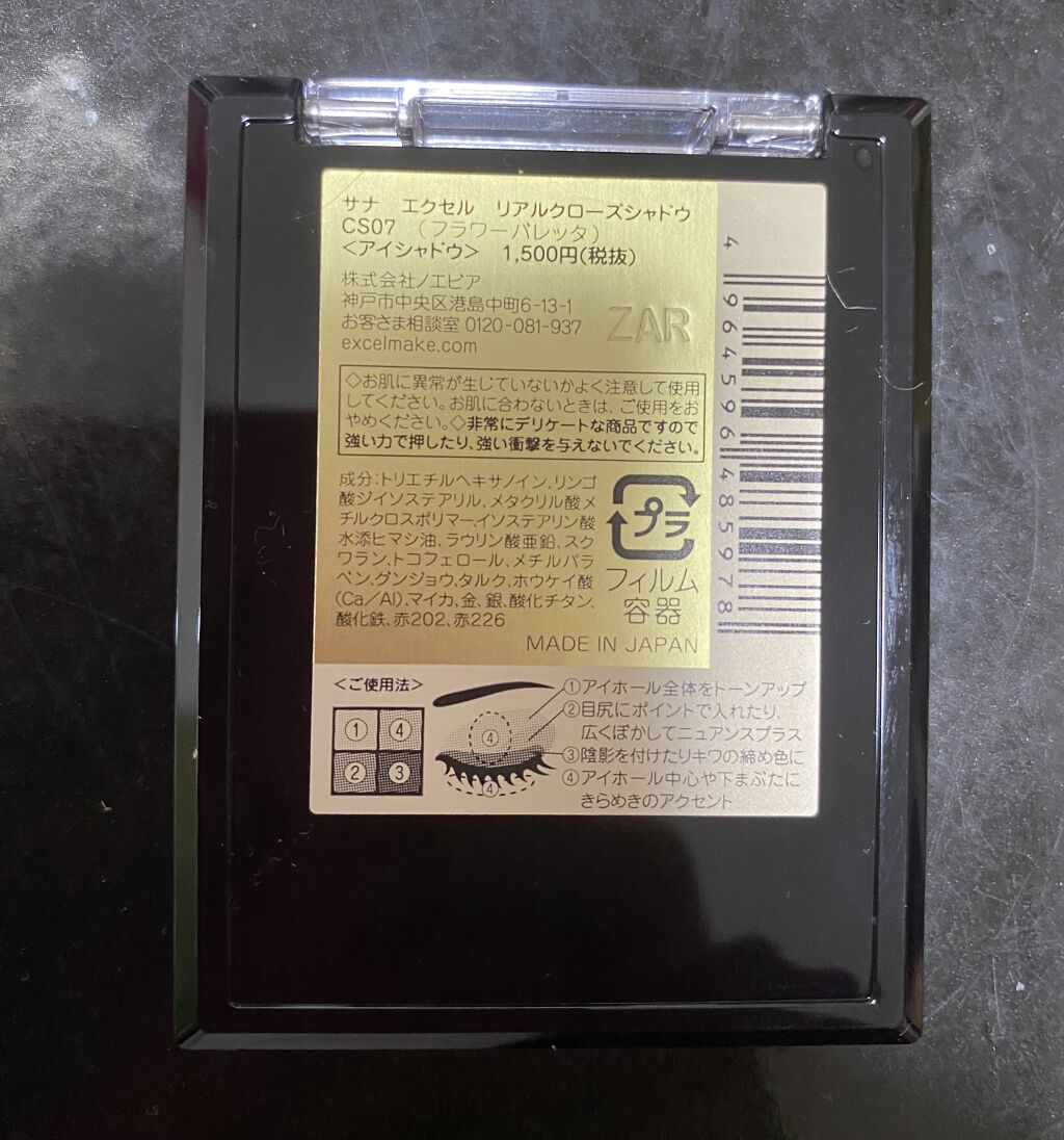 ☆excelリアルクローズシャドウCS07フラワーバレッタ成分トリエチルヘキサノイン、リンゴ酸ジイソステアリル、メタクリル酸メチルクロスポリマー、イソステアリン酸水添ヒマシ油、ラウリン酸亜鉛、スクワラン、トコフェロール、メチルパラベン、グンシ...