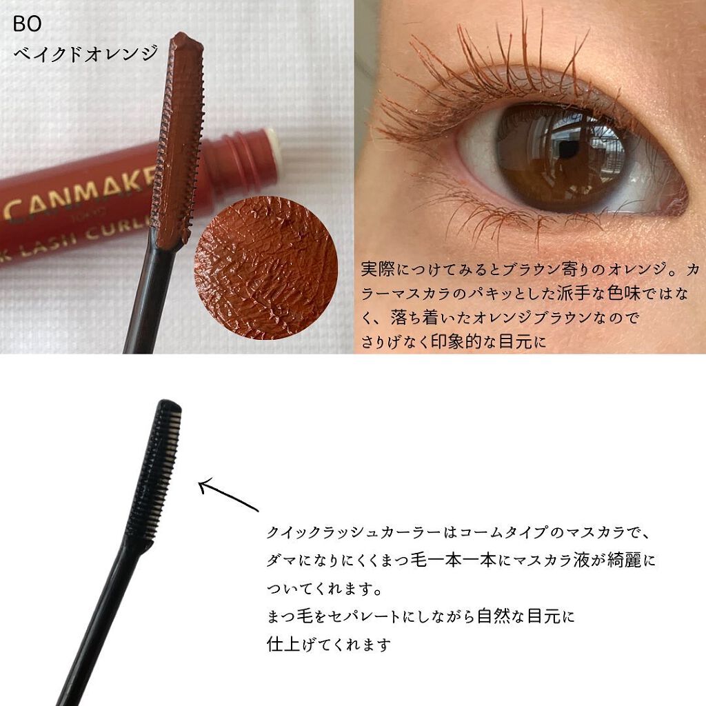 ダブルコームタイプのマスカラで、まつげを持ち上げるショート面・セパレートするロング面が特徴的な形になってるよ♪ 使ったカラーの「BO ベイクドオレンジ」はオレンジブラウンのカラー。まつげに塗るとテラコッタカラーになって可愛かった! ブラウンメイクやピンクメイクに合わせて使いたいな〜💕