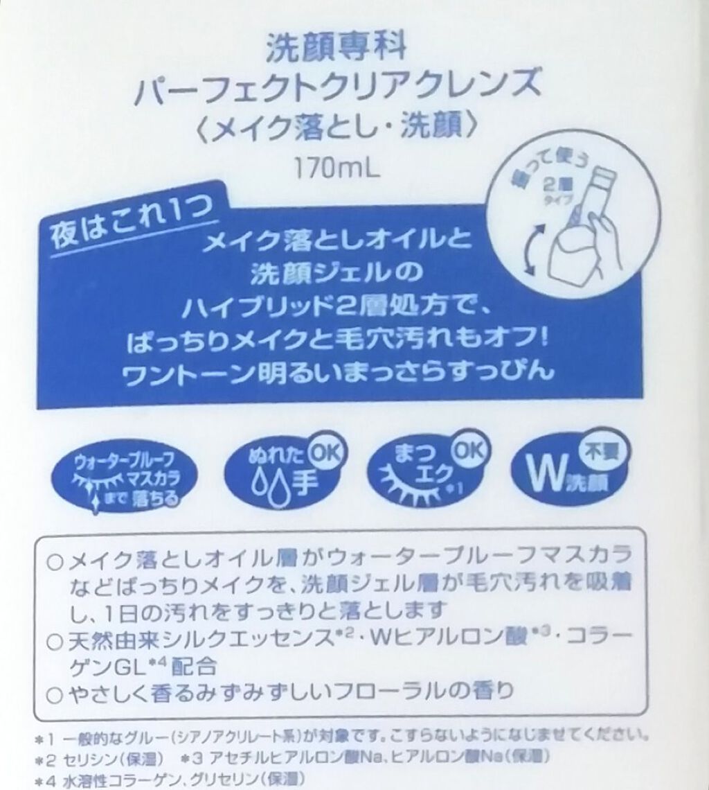 - メイク落としオイルと洗顔ジェルのハイブリッド2層処方で”オイル並みの洗浄力”と”洗顔並みのさっぱり感”を叶え、ワントーン明るいまっさらすっぴん。 ○メイク落としオイル層がウォータープルーフマスカラなどばっちりメイクを、洗顔ジェル層が毛穴の皮脂汚れを吸着し、1日の汚れをすっきりと落とします。 ○天然由来シルクエッセンス*2・Wヒアルロン酸*3・コラーゲンGL*4配合 ○やさしく香るみずみずしいフローラルの香り ○アルコールフリー・アレルギーテスト済み*5 *2 セリシン(保湿) *3 アセチルヒアルロン酸 Na、ヒアルロン酸 Na(保湿) *4 水溶性コラーゲン、グリセリン(保湿) *5 全てのかたにアレルギーが起きないというわけではありません。