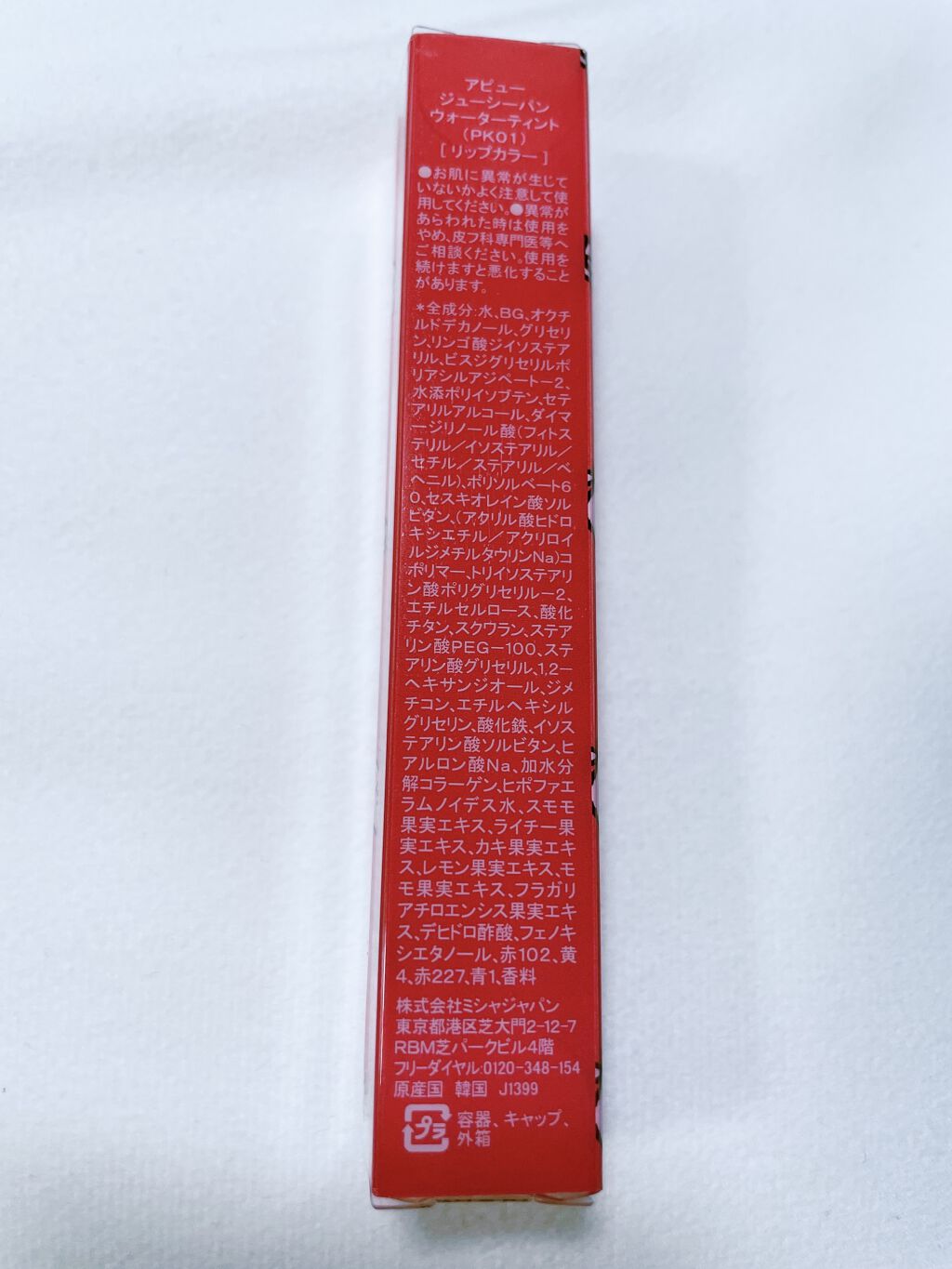 - <BE01 ピーチ> 水、BG、オクチルドデカノール、グリセリン、リンゴ酸ジイソステアリル、ビスジグリセリルポリアシルアジペート-2、水添ポリイソブテン、セテアリルアルコール、ダイマージリノール酸(フィトステリル/イソステアリル/セチル/ステアリル/ベヘニル)、ポリソルベート60、セスキオレイン酸ソルビタン、(アクリル酸ヒドロキシエチル/アクリロイルジメチルタウリンNa)コポリマー、エチルセルロース、トリイソステアリン酸ポリグリセリル-2、スクワラン、酸化チタン、ステアリン酸PEG-100、ステアリン酸グリセリル、1,2-ヘキサンジオール、ジメチコン、エチルヘキシルグリセリン、酸化鉄、イソステアリン酸ソルビタン、ヒアルロン酸Na、加水分解コラーゲン、ヒポファエラムノイデス水、スモモ果実エキス、ライチー果実エキス、カキ果実エキス、レモン果実エキス、モモ果実エキス、フラガリアチロエンシス果実エキス、デヒドロ酢酸、フェノキシエタノール、赤227、黄5、黄4、赤102、青1、香料 <CR01 甘柿> 水、BG、オクチルドデカノール、グリセリン、リンゴ酸ジイソステアリル、ビスジグリセリルポリアシルアジペート-2、水添ポリイソブテン、セテアリルアルコール、ダイマージリノール酸(フィトステリル/イソステアリル/セチル/ステアリル/ベヘニル)、トリイソステアリン酸ポリグリセリル-2、ポリソルベート60、セスキオレイン酸ソルビタン、(アクリル酸ヒドロキシエチル/アクリロイルジメチルタウリンNa)コポリマー、エチルセルロース、スクワラン、酸化チタン、ステアリン酸PEG-100、酸化鉄、ステアリン酸グリセリル、1,2-ヘキサンジオール、ジメチコン、エチルヘキシルグリセリン、イソステアリン酸ソルビタン、ヒアルロン酸Na、加水分解コラーゲン、ヒポファエラムノイデス水、スモモ果実エキス、ライチー果実エキス、カキ果実エキス、レモン果実エキス、モモ果実エキス、フラガリアチロエンシス果実エキス、デヒドロ酢酸、フェノキシエタノール、黄5、黄4、赤2、赤201、青1、香料 <CR02 ライチ> 水、BG、オクチルドデカノール、グリセリン、リンゴ酸ジイソステアリル、ビスジグリセリルポリアシルアジペート-2、水添ポリイソブテン、セテアリルアルコール、ダイマージリノール酸(フィトステリル/イソステアリル/セチル/ステアリル/ベヘニル)、ポリソルベート60、セスキオレイン酸ソルビタン、(アクリル酸ヒドロキシエチル/アクリロイルジメチルタウリンNa)コポリマー、エチルセルロース、トリイソステアリン酸ポリグリセリル-2、スクワラン、ステアリン酸PEG-100、ステアリン酸グリセリル、1,2-ヘキサンジオール、ジメチコン、酸化チタン、エチルヘキシルグリセリン、酸化鉄、イソステアリン酸ソルビタン、ヒアルロン酸Na、加水分解コラーゲン、ヒポファエラムノイデス水、スモモ果実エキス、ライチー果実エキス、カキ果実エキス、レモン果実エキス、モモ果実エキス、フラガリアチロエンシス果実エキス、デヒドロ酢酸、フェノキシエタノール、黄5、赤202、赤2、橙205、青1、香料 <RD01 ストロベリー> 水、BG、オクチルドデカノール、グリセリン、リンゴ酸ジイソステアリル、ビスジグリセリルポリアシルアジペート-2、水添ポリイソブテン、セテアリルアルコール、ダイマージリノール酸(フィトステリル/イソステアリル/セチル/ステアリル/ベヘニル)、ポリソルベート60、セスキオレイン酸ソルビタン、(アクリル酸ヒドロキシエチル/アクリロイルジメチルタウリンNa)コポリマー、トリイソステアリン酸ポリグリセリル-2、エチルセルロース、スクワラン、ステアリン酸PEG-100、ステアリン酸グリセリル、1,2-ヘキサンジオール、酸化チタン、ジメチコン、エチルヘキシルグリセリン、イソステアリン酸ソルビタン、ヒアルロン酸Na、酸化鉄、加水分解コラーゲン、ヒポファエラムノイデス水、スモモ果実エキス、ライチー果実エキス、カキ果実エキス、レモン果実エキス、モモ果実エキス、フラガリアチロエンシス果実エキス、デヒドロ酢酸、フェノキシエタノール、赤202、赤102、赤2、黄4、赤227、青1、香料 <PK01 ピンクレモン> 水、BG、オクチルドデカノール、グリセリン、リンゴ酸ジイソステアリル、ビスジグリセリルポリアシルアジペート-2、水添ポリイソブテン、セテアリルアルコール、ダイマージリノール酸(フィトステリル/イソステアリル/セチル/ステアリル/ベヘニル)、ポリソルベート60、セスキオレイン酸ソルビタン、(アクリル酸ヒドロキシエチル/アクリロイルジメチルタウリンNa)コポリマー、トリイソステアリン酸ポリグリセリル-2、エチルセルロース、酸化チタン、スクワラン、ステアリン酸PEG-100、ステアリン酸グリセリル、1,2-ヘキサンジオール、ジメチコン、エチルヘキシルグリセリン、酸化鉄、イソステアリン酸ソルビタン、ヒアルロン酸Na、加水分解コラーゲン、ヒポファエラムノイデス水、スモモ果実エキス、ライチー果実エキス、カキ果実エキス、レモン果実エキス、モモ