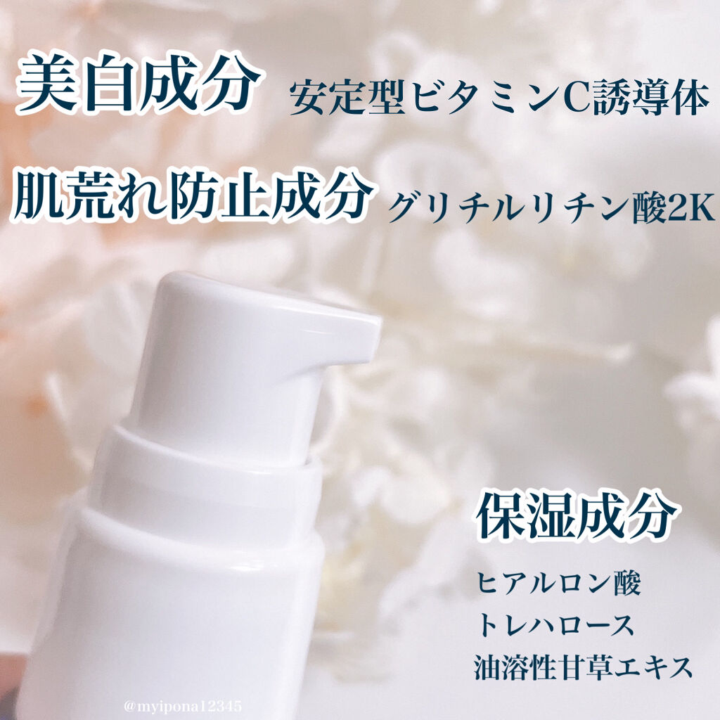 - <有効成分>L-アスコルビン酸 2-グルコシド 2.00%, グリチルリチン酸2K 0.10% <その他の成分>保湿成分:濃グリセリン 8.00%, BG 2.72%, トレハロース液 1.00%, ヒアルロン酸ナトリウム(2) 0.05%, 油溶性甘草エキス(2) 0.01%未満 pH調整剤:水酸化K 0.40%, クエン酸Na 適量, クエン酸 適量 増粘剤:キサンタンガム 0.30%, ヒドロキシエチルセルロース 0.30% 可溶化剤:ポリオキシエチレン硬化ヒマシ油 0.50% 防腐剤:メチルパラベン 0.21%, フェノキシエタノール 0.11% キレート剤:EDTA-2Na 0.10% 製品の酸化防止剤:天然ビタミンE 0.10% 基剤:精製水 全量を100%とする