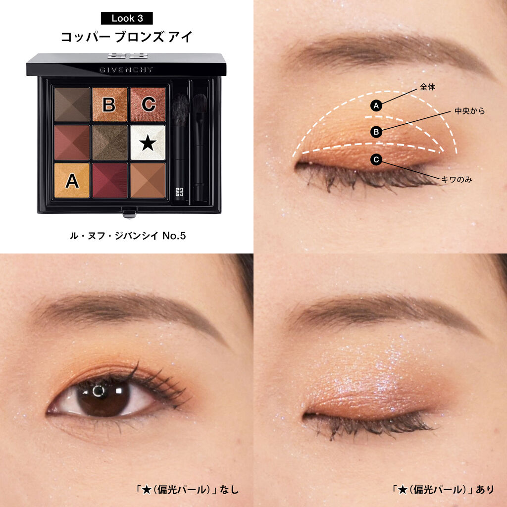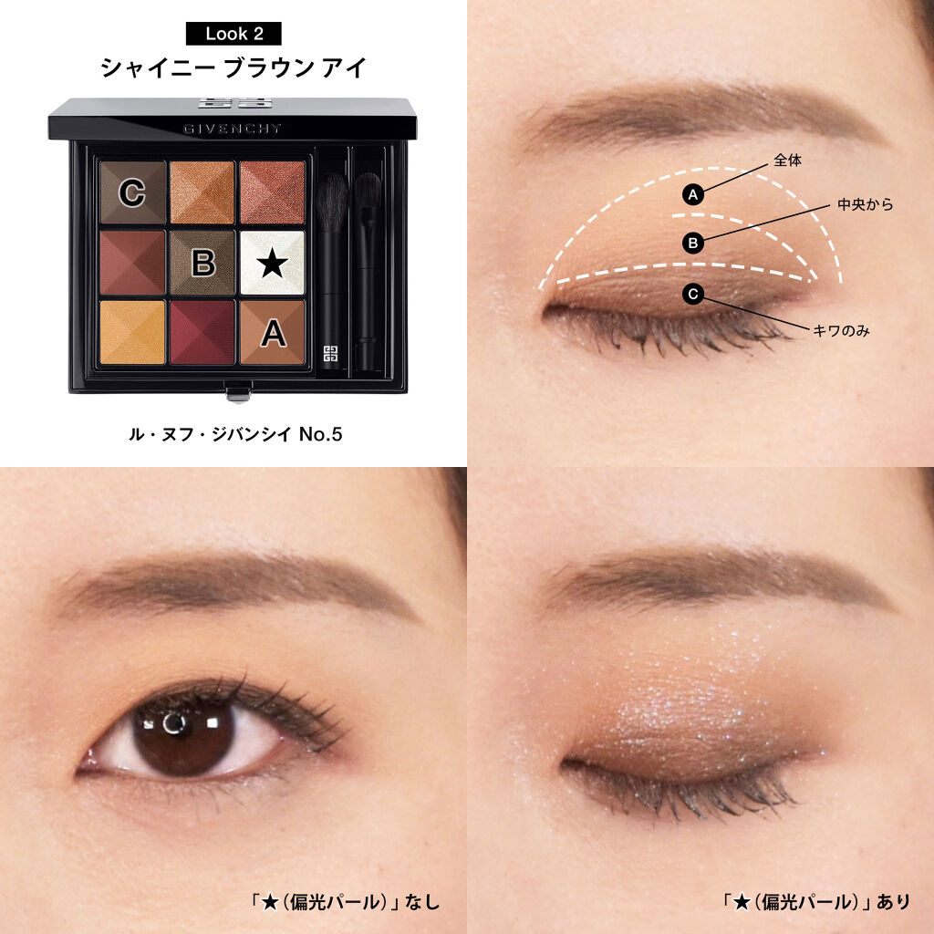 - ジバンシイが選び抜いた、9色ミックスの新アイシャドウ。 フランス語で数字の『9』を表す “neuf(ヌフ)” の言葉のとおり、マット、サテン、グリッター、メタリックの4種のテクスチュアからなる9色で構成されています。塗布すると肌に吸い付くようになじむテクスチュア。ロングラスティングで、メイク直後の美しい仕上がりが、長時間持続します。2種類のブラシをセットできるアプリケーター付き。
