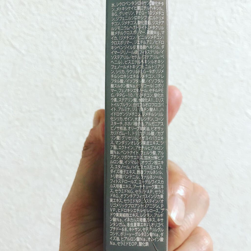 - 水、シクロペンタシロキサン、酸化チタン、メトキシケイヒ酸エチルヘキシル、BG、グリセリン、PEG-10ジメチコン、ジフェニルシロキシフェニルトリメチコン、ジメチコン、酸化亜鉛、ジステアルジモニウムヘクトライト、メタクリル酸メチルクロスポリマー、硫酸Mg、マイカ、(ジメチコン/ビニルジメチコン)クロスポリマー、ジエチルアミノヒドロキシベンゾイル安息香酸ヘキシル、ダイマージリノール酸(フィトステリル/イソステアリル/セチル/ステアリル/ベヘニル)、ビスエチルヘキシルオキシフェノールメトキシフェニルトリアジン、シリカ、ラウリルPEG-9ポリジメチルシロキシエチルジメチコン、(テレフタル酸/イソフタル酸/イソフタル酸スルホン酸Na/グリコール)コポリマー、フェノキシエタノール、セチルPEG/PPG-10/1ジメチコン、窒化ホウ素、ステアリン酸、水酸化Al、ミリストイルプルラン、合成フルオロフロゴパイト、アルミナ、ジミリスチン酸Al、ハイドロゲンジメチコン、ジメチルシリル化シリカ、ゼイン、水添レシチン、コーンスターチ、ホホバ種子油、アルガニアスピノサ核油、オリーブ果実油、ビオサッカリドガム-1、トリ(カプリル酸/カプリン酸)グリセリル、イザヨイバラエキス、マンダリンオレンジ果皮エキス、シア脂、エクトイン、アセチルヒアルロン酸Na、ベントナイト、フェルラ酸、アルブチン、ツボクサエキス、加水分解ヒアルロン酸、イソマルト、オウゴン根エキス、エタノール、ハイビスカス花エキス、ダイズ種子エキス、酢酸ファルネシル、トリ酢酸パンテニル、ファルネソール、フィトステロールズ、エーデルワイスカルス培養エキス、アーチチョーク葉エキス、セラミドNG、セラミドAP、セラミドAG、オプンチアフィクスインジカ果実エキス、セラミドNP、システイン/オリゴメリックプロアントシアニジン、PVP、ヒドロキシエチルセルロース、ブドウ果実細胞エキス、レシチン、アルギン酸Na、イネカルス培養エキス、キサンタンガム、冬虫夏草エキス、オリゴペプチド-68、キトサン、セテアリルグルコシド、ポリ-γ-グルタミン酸Na、ダイズ油、ヒアルロン酸Na、オレイン酸Na、セラミドEOP、酸化鉄