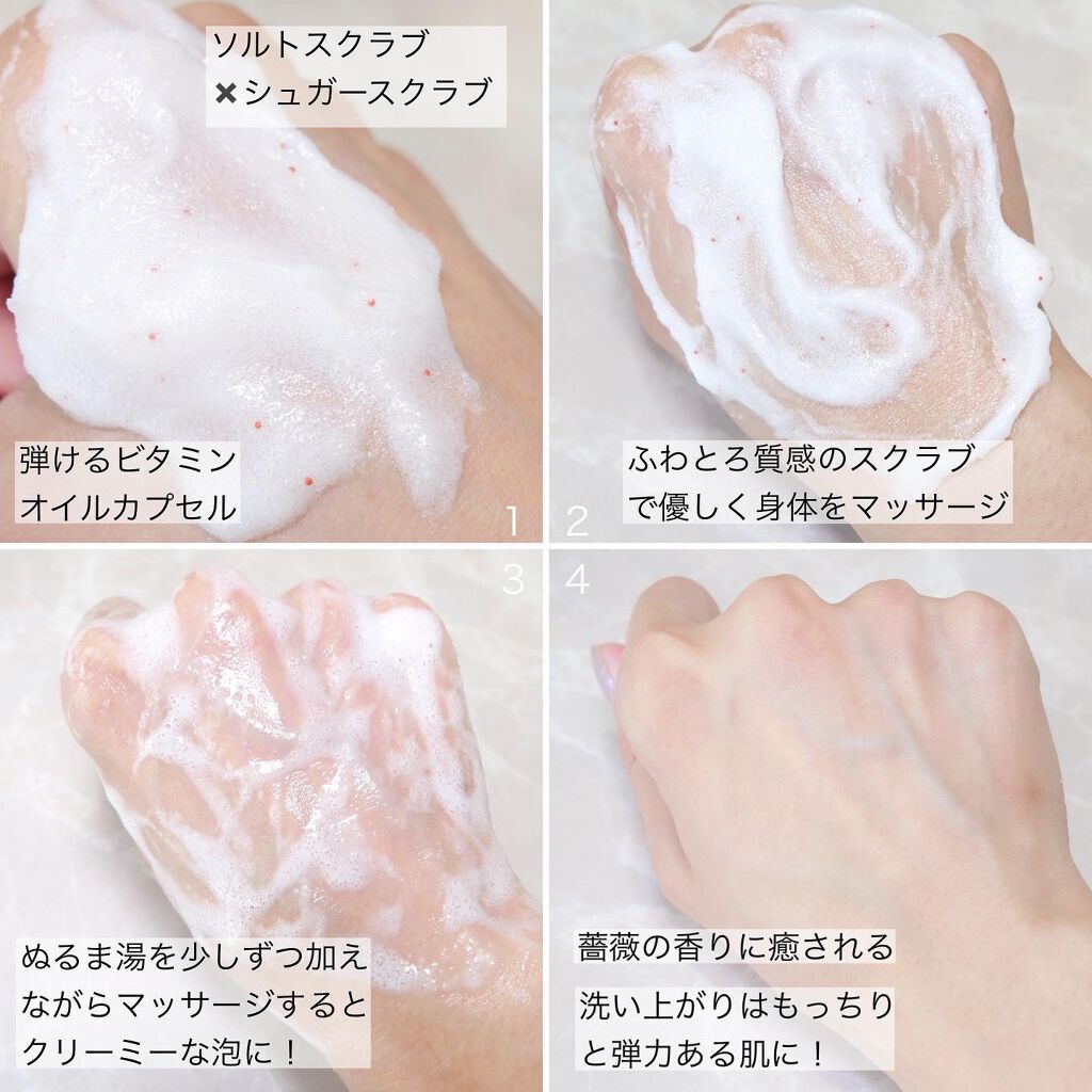 - 週に1回ボディソープの代わりに使用して、つるつるでしっとりとした肌に洗い上げる、ボディ用スクラブ洗浄料です。ミネラルを含む海塩と水分を保持するシュガーのWスクラブ配合で、くすみやざらつきが気になる肌の角質をマイルドに落とします。ぬるま湯を少しずつ加えてマッサージしながら肌にのばすと、クリーミィーな泡状になり、角質ケアと同時に洗浄ケアができます。ビタミンオイルカプセルを含む厳選した美容液成分配合。ねっとりとしたスクラブソープがつるつるしっとりした柔らかく美しい肌へ洗いあげます。