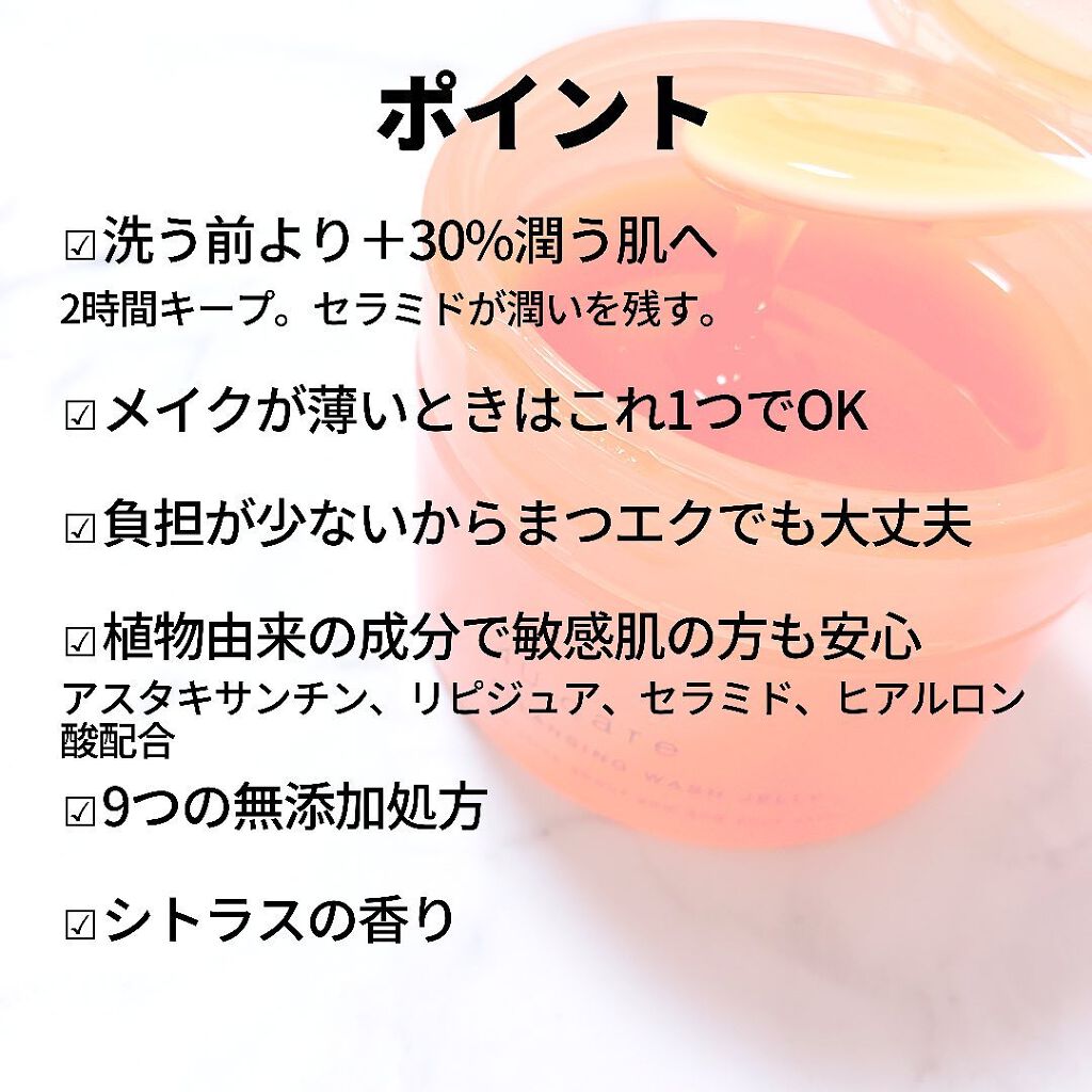 - 9種の無添加処方と独自処方※1セラミドジェリーシールドを採用。「ジェリー」の厚みで、直接肌をこすらず、メイクや毛穴の汚れをジェリーに絡めとり、肌にセラミドの潤いベールを残し、乾燥から肌をしっかり守ります。鮮やかなオレンジ色は、アスタキサンチンを配合しており、強い抗酸化力で肌のダメージ修復をサポートします。 90%美容液成分で洗う前より30%潤い、2時間後も潤いが続くクレンジング洗顔ジェリーです。 その日のメイクに合わせて、クレンジングにも、泡の立たない洗顔としてもOK 洗いすぎを防ぐために、クレンジング機能も洗浄成分も配合し、両方の機能が穏やかに働く処方を実現。メイクの薄いナチュラルメイクの時は、これ1つで完了。しっかりメイクの時は、ポイントリムーバーなどの利用後、泡の立たない洗顔料に。 ※1:セラミドジェリーシールド処方とは、(PEG-240/デシルテトラデセス-20/HDI)コポリマー、セラミドNG,ヒアルロン酸Na,アスタキサンチン、フラーレン、ポリクオタニウム-51で洗い上がりの肌表面に美容液膜を残す独自処方を指します。