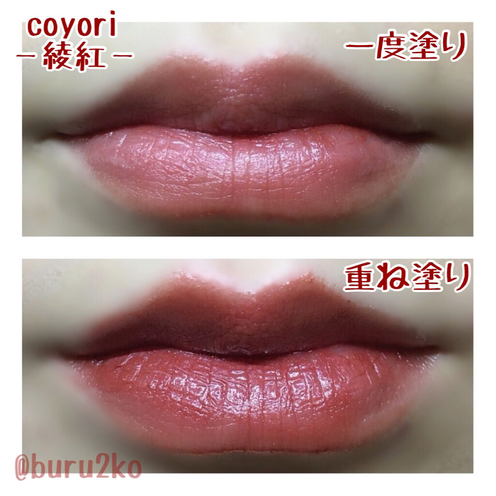 - 数量限定 唇の色を活かして発色。肌に馴染んで上品な「赤」に変化。 一般的な染料を使用した口紅は、分子が唇を覆い均一に発色するため唇の色を問わず同じ色になります。Coyori-綾紅-は処方特性によって顔料が分散し、元の唇の色を活かして発色。イエローベースにもブルーベースにもよりすぎず、誰にでも似合う血色感を演出します。また、少しだけ青みをプラスしているので、年齢による黄ぐすみをカバーします。