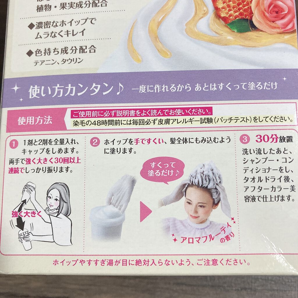 ビューティラボホイップヘアカラーモノトーングレイ内容はカラー剤1,2カップ手袋洗い流さないトリートメント説明書まずカラー剤2つをカップに入れて強めに30回振ってホイップ状にします🫧あとは満遍なく塗って放置!泡タイプなので簡単でムラになりにくい...
